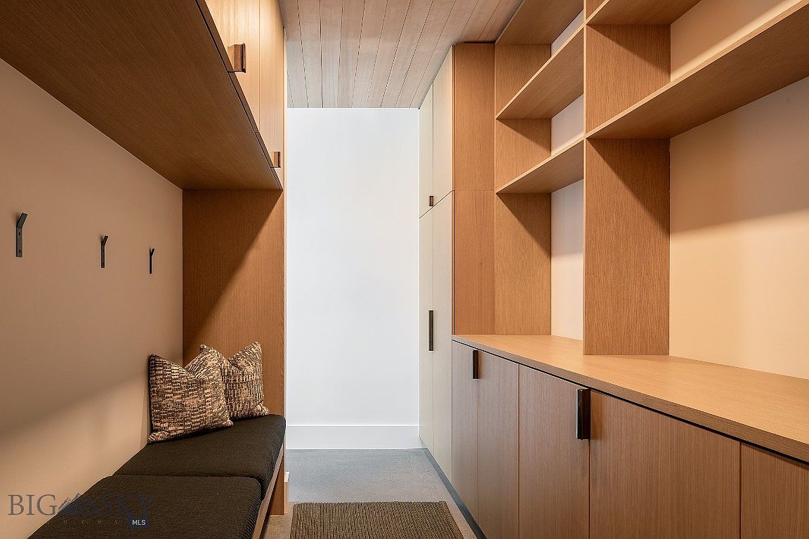 This mudroom combines functionality with modern design, featuring a practical layout that welcomes you home. Sleek cabinetry, crafted from warm wood tones, provides ample storage for shoes and gear, while an inviting bench offers a place to sit and remove boots. The soft neutral color scheme enhances the sense of space, creating a serene atmosphere. Thoughtfully placed hooks line the walls, ideal for quick access to bags and outerwear. Cozy throw pillows add a touch of comfort, while the ceiling’s light wood finish brings an airy feel, making this a perfect family-friendly entryway.