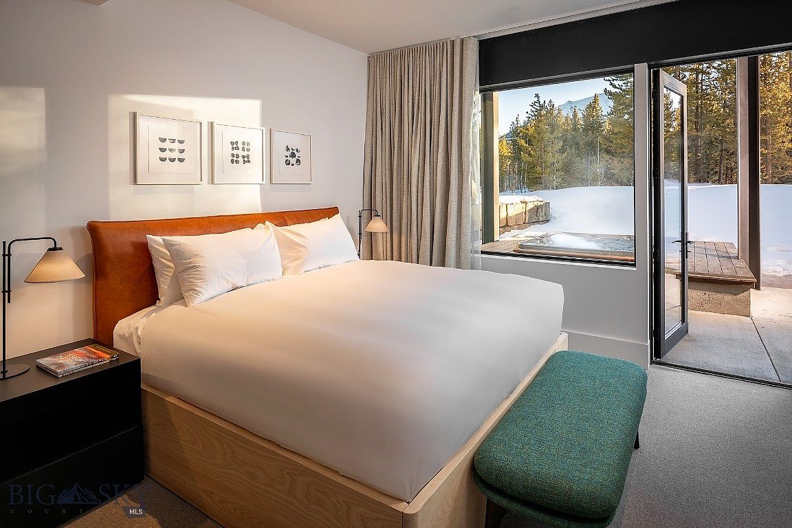 This serene master bedroom features a sleek, modern design enhanced by natural light streaming through floor-to-ceiling windows. A plush, oversized bed with crisp white linens and a brown leather headboard exudes comfort. Beside it, a minimalist black nightstand holds a carefully placed reading lamp, perfect for evening relaxation. A cozy, upholstered bench adds extra seating and visual interest. The light gray walls and neutral tones create a calming atmosphere, while the soft carpet underfoot adds warmth. Just outside, a private patio invites nature in, blending indoor luxury with stunning outdoor views, ideal for tranquil mornings or late-night stargazing.