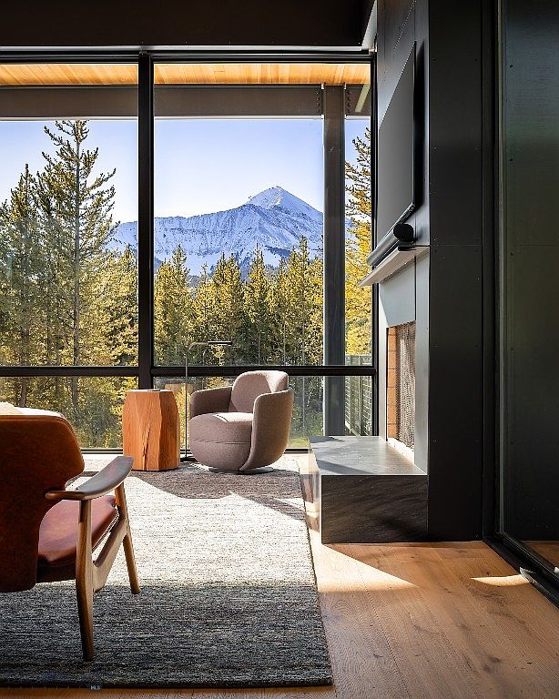 This inviting living area is designed for comfort and relaxation, featuring a plush, rounded armchair and a sleek wooden side table. Expansive floor-to-ceiling windows provide breathtaking views of the snow-capped mountains, seamlessly blending nature into the home’s aesthetic. The earthy color palette, complemented by warm woods and cozy textiles, creates a welcoming atmosphere. A modern fireplace adds to the charm, perfect for family gatherings or quiet evenings. The layout encourages conversation and connection, making it ideal for family-friendly living. Subtle lighting fixtures enhance the ambiance, ensuring this space feels both stylish and inviting.