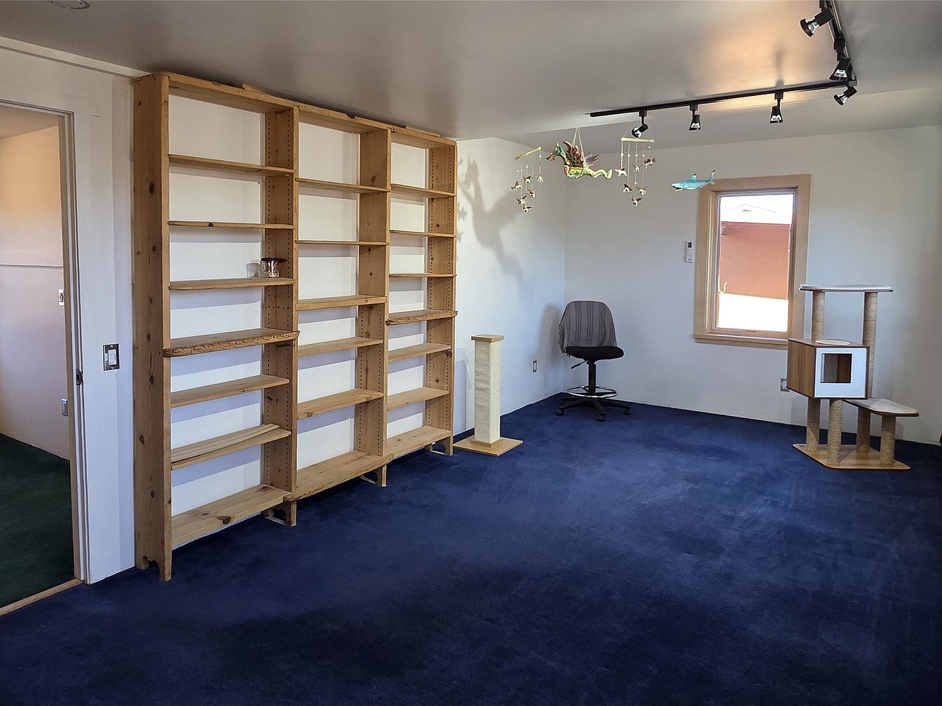 This inviting home office features a spacious layout with soft blue carpeting, offering comfort and a cozy atmosphere. A wooden shelving unit spans one wall, perfect for books or decor. Adjacent, a simple office chair faces a bright window, providing natural light that enhances productivity. The charming cat tree in the corner adds a playful touch, showcasing family-friendly design catering to pet lovers. Track lighting illuminates the room, highlighting its clean lines and minimalist aesthetic. With a calming color scheme and thoughtful features, this space balances functionality and warmth, ideal for work or relaxation.
