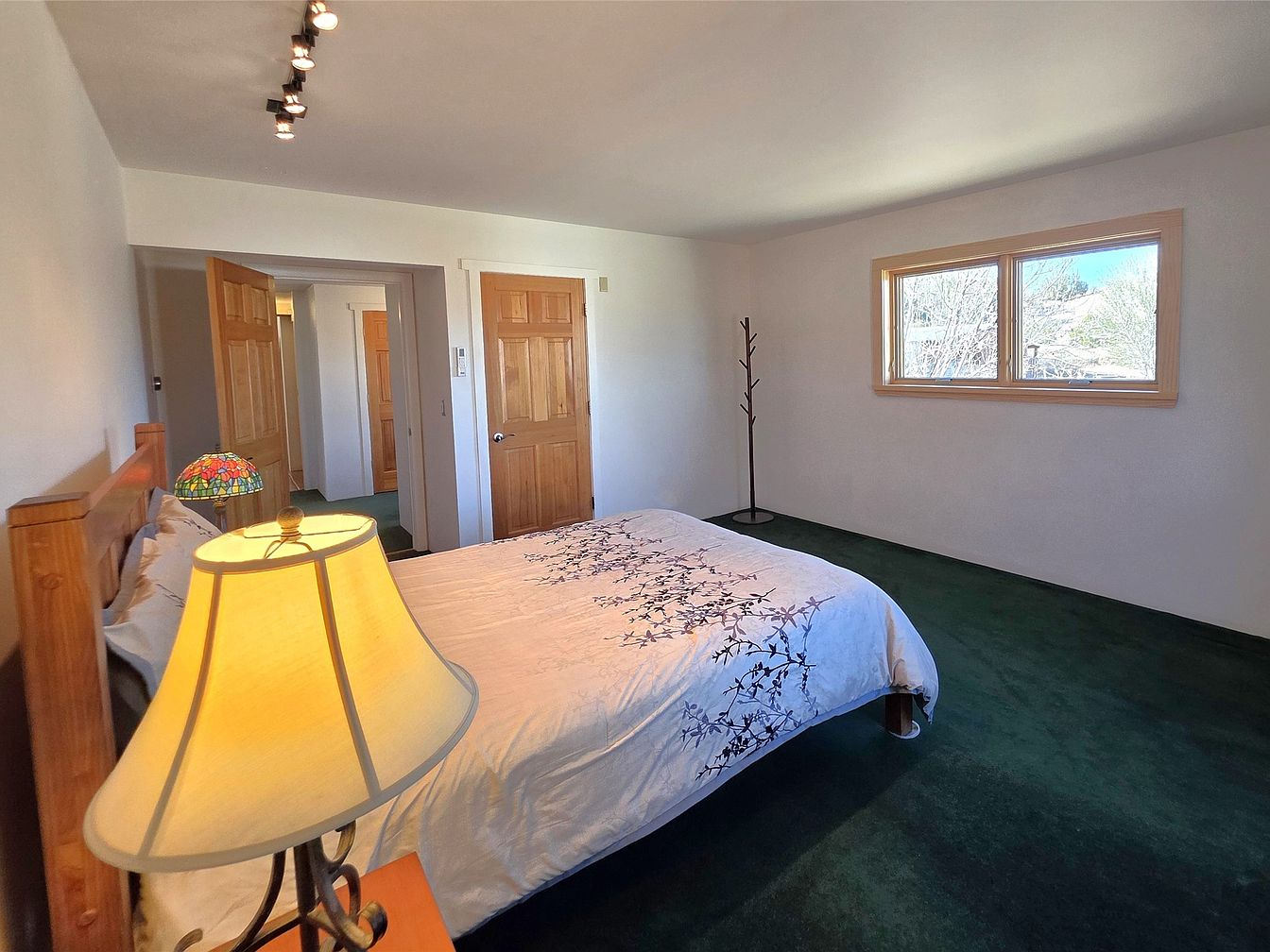 This master bedroom features an open layout, creating a sense of tranquility and space. The plush green carpeting contributes warmth while the soft white walls reflect abundant natural light, enhancing the room’s inviting atmosphere. A wooden bed frame boasts delicate floral patterns on the bedding, seamlessly integrating comfort and style. Complementing the aesthetic, a charming bedside lamp adds a touch of vintage elegance. Large double windows frame picturesque views, creating a serene retreat. Architectural details like the clean lines of the wood doors and modern track lighting elevate the room’s design, making it perfect for relaxation or family gatherings.