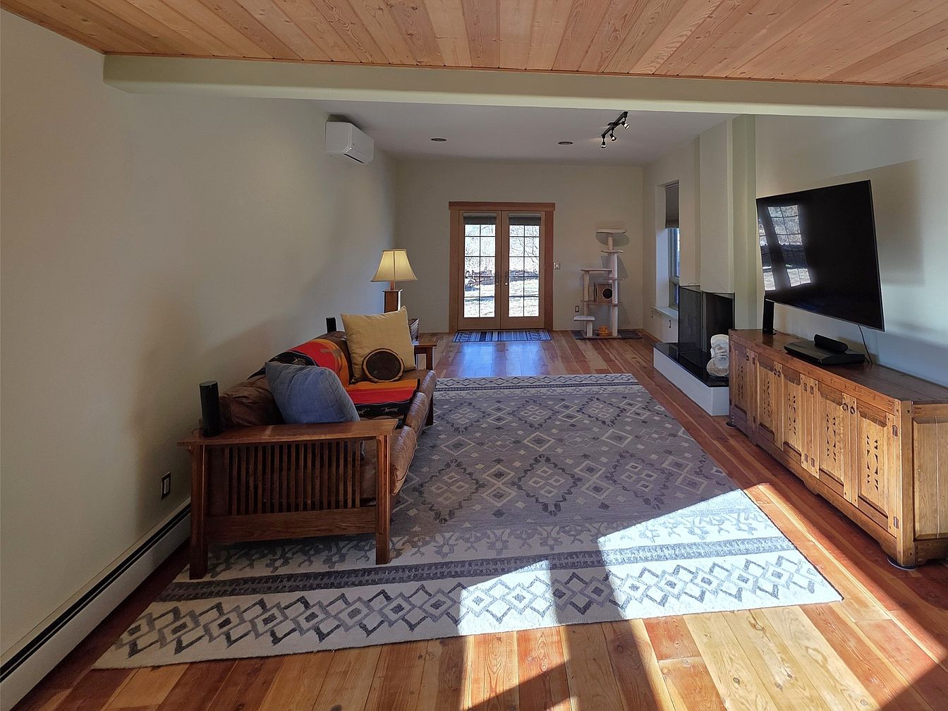 This inviting living room showcases a blend of comfort and modern aesthetics. Featuring warm wooden flooring that extends seamlessly with radiant beams overhead, the space is bathed in natural light from the large double doors. A plush sofa adorned with colorful cushions brings a touch of personality, while a stylish area rug grounds the area. Subtle neutral walls contrast with rich wooden furniture, including a media console and a side table, enhancing the cozy atmosphere. A unique fireplace adds a sophisticated focal point, perfect for family gatherings, while ample space encourages movement and interaction.
