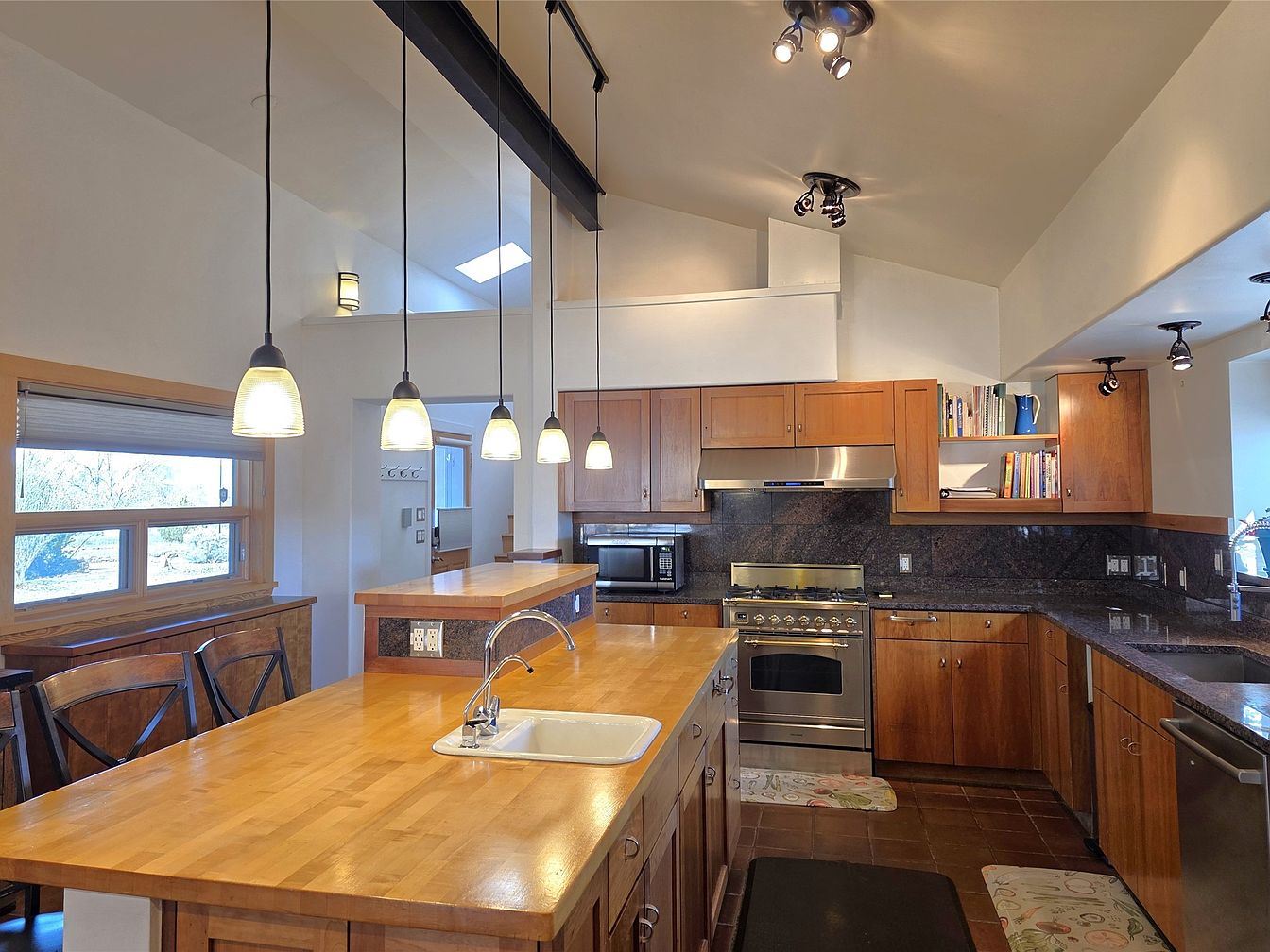 This inviting kitchen showcases a blend of functionality and style, featuring a spacious layout that encourages family interaction. The centerpiece is a large wooden island with a sink, offering ample workspace and casual seating. Warm wooden cabinetry contrasts beautifully with the dark granite countertops, which add an elegant touch. Pendant lighting illuminates the space, casting a soft glow over the area. High-quality appliances and organized shelving further enhance the kitchen’s efficiency. Within this family-friendly environment, the large windows bring in natural light, creating a warm and welcoming atmosphere perfect for gatherings and culinary adventures.
