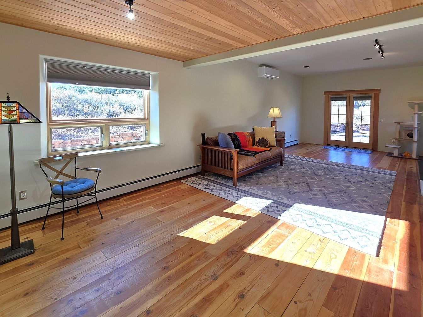 This spacious living room showcases a harmonious blend of comfort and modern design. Natural light pours in through large windows, illuminating rich, polished hardwood floors that exude warmth. The minimalist decor features a stylish sofa adorned with colorful throw pillows, inviting relaxation. A cozy lamp with a stained-glass design adds a touch of artistry, while a soft area rug defines the seating space. The open layout encourages flow, connecting to a charming set of French doors that lead outside, perfect for family gatherings. Subtle wall tones complement the wooden ceiling, creating an inviting atmosphere for all.