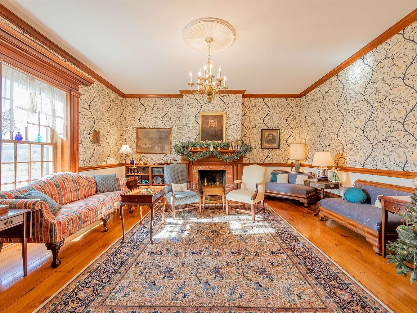 This inviting living room features a harmonious blend of vintage and modern elements, showcasing elegant architectural details like intricate crown molding and rich wood accents. The walls are adorned with a delicate, swirling pattern that complements the warm color palette. A striped sofa invites relaxation, paired with stylish armchairs, creating a perfect family-friendly space. The carefully arranged coffee table rests on a beautifully patterned area rug, adding warmth beneath the feet. Natural light streams through large windows, enhancing the room’s cheerful ambiance. Classic lamps and tasteful artwork provide additional charm, making this a delightful area for gatherings.