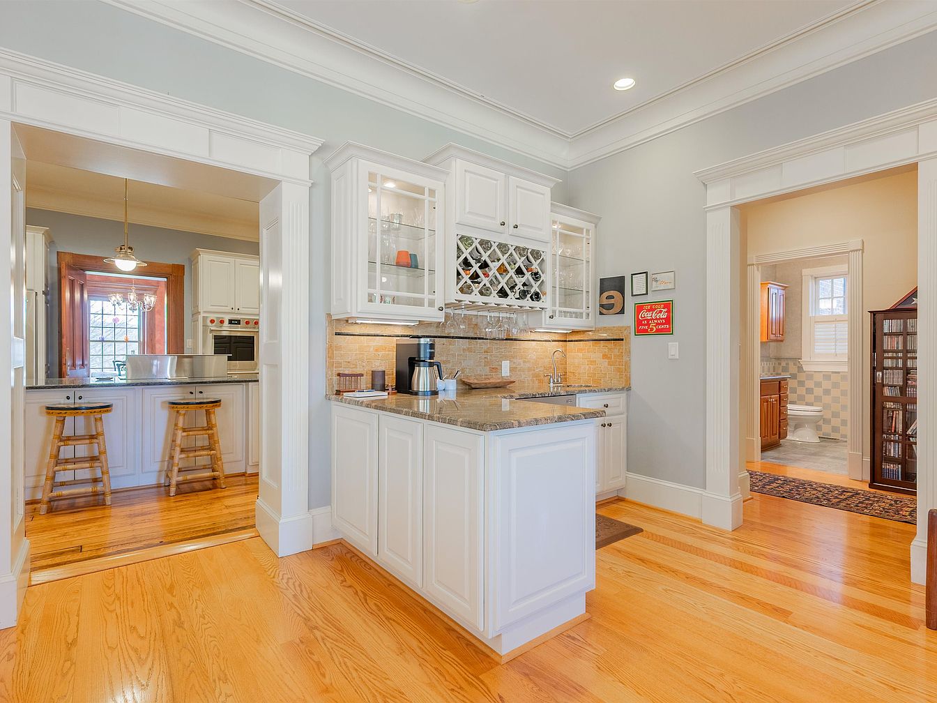 This inviting kitchen nook features a seamless blend of traditional and contemporary design elements. The airy open layout boasts polished hardwood floors that enhance the warmth of the space. Crisp white cabinetry contrasts beautifully with the speckled granite countertops, while glass-fronted cabinets add a touch of elegance. Two sturdy wooden stools provide a casual dining option at the bar area, fostering family gatherings. Warm natural light pours in through the adjacent window, complemented by decorative light fixtures. Subtle accents, like vintage signage, infuse character, making this a perfect spot for both cooking and enjoying family moments.