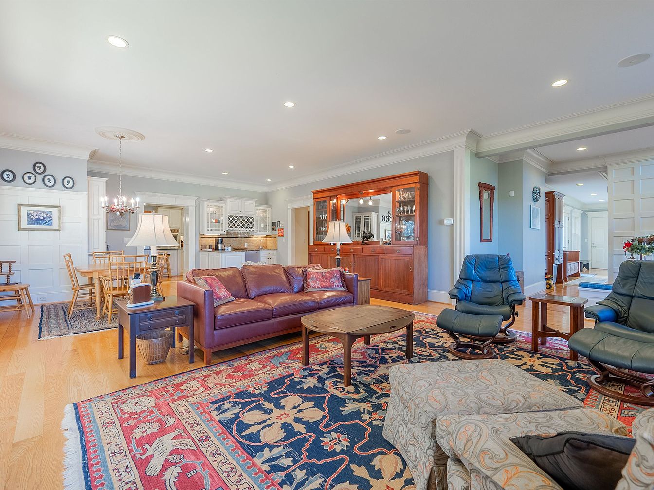 This inviting living room seamlessly combines comfort and style, featuring a rich leather sofa that offers ample seating. Warm wood tones and elegant area rugs create a cozy atmosphere, while the open layout leads into a well-appointed dining area and a modern kitchen. Family-friendly features include sturdy furnishings and a large dining table, perfect for gatherings. The soft gray walls, complemented by light fixtures and classic wainscoting, enhance the airy feel of the space. Accent chairs and a rustic coffee table add character, while framed family photos give a personal touch, making it a perfect family hub.