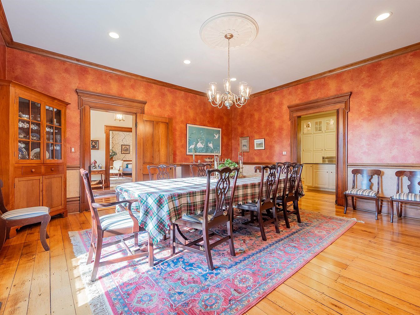 This spacious dining room features a classic layout with a long, ornate wooden table, perfect for family gatherings. A striking plaid tablecloth contrasts beautifully with the warm, textured red walls, complemented by decorative molding that adds depth. Elegant wooden chairs surround the table, ensuring comfort for guests. A vintage chandelier hangs gracefully above, casting soft light over the scene. Rich hardwood flooring enhances the room’s charm, while a Persian rug adds a pop of color and texture underfoot. Built-in cabinetry showcases fine china, creating a welcoming ambiance that invites conversation and connection.