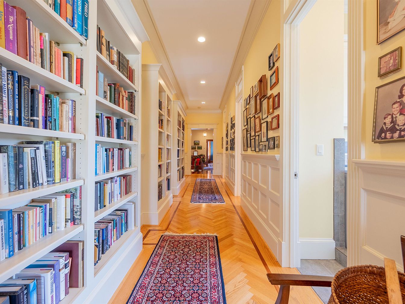 A beautifully designed hallway features elegant built-in bookshelves lined with a diverse selection of books, inviting both learning and leisure. Rich, warm wood herringbone flooring complements the light yellow walls, creating a bright, airy atmosphere. Family-friendly elements include space for memorabilia displayed in framed photos along one wall, fostering a sense of community and connection. Decorative rugs add a touch of comfort underfoot, while recessed lighting provides a well-lit path. This hallway serves as a perfect blend of function and style, seamlessly connecting various parts of the home while celebrating the joy of family interactions and shared stories.