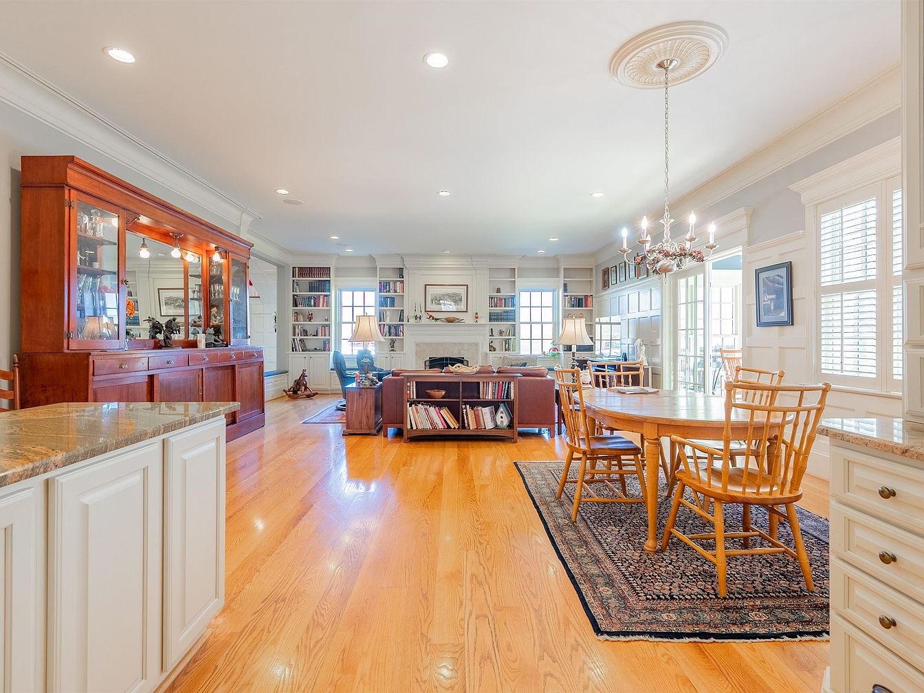 This inviting open-concept living area seamlessly blends relaxation and functionality. The hardwood floors radiate warmth, complemented by a neutral color palette of soft grays and whites. A striking wooden dining table, surrounded by classic spindle-back chairs, creates a cozy gathering spot, while the elegant chandelier adds a touch of sophistication. Across the room, a rich mahogany display cabinet showcases cherished items and connects to a plush seating area around a stylish coffee table. Built-in bookshelves flanking the room enhance the decor, inviting family moments, while large windows fill the space with natural light, fostering a welcoming ambiance.