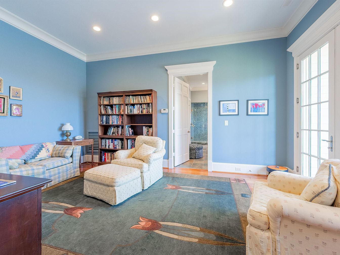 A serene reading nook features soothing blue walls and an inviting layout, creating a tranquil atmosphere. A comfortable, patterned sofa and plush armchair provide ample seating, perfect for family gatherings or quiet moments. The rich wood tones of the furniture complement the soft upholstery, while a decorative area rug adds warmth and character. A quaint bookcase showcases an array of books, encouraging a love for reading. Natural light floods the space through elegant glass doors, leading to a bright outdoor area. This thoughtfully designed corner blends comfort and style, ideal for relaxation and cherished family time.
