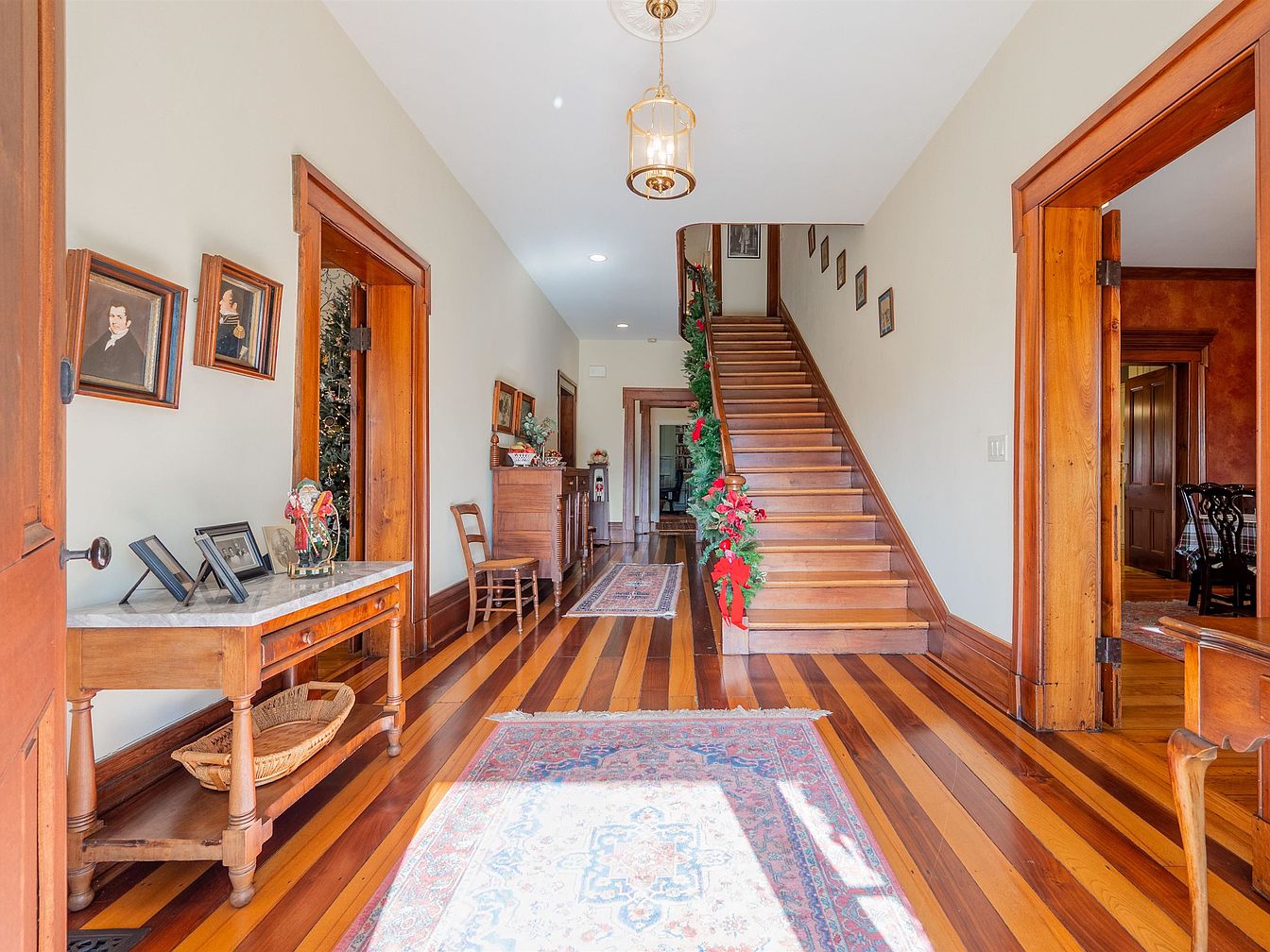 The entryway welcomes visitors with its rich, polished hardwood floors showcasing a captivating blend of warm tones. A traditional staircase, framed by robust woodwork, ascends gracefully, hinting at the home’s spacious layout. Family-friendly features abound, such as the convenient side table adorned with framed photos and festive decor. Elegant artwork adorns the walls, adding a personal touch, while the soothing neutral color palette promotes a calming atmosphere. Decorative elements like a vintage rug and tasteful holiday greenery invite warmth, making this hall not just a passage but a charming introduction to the home’s character and charm.