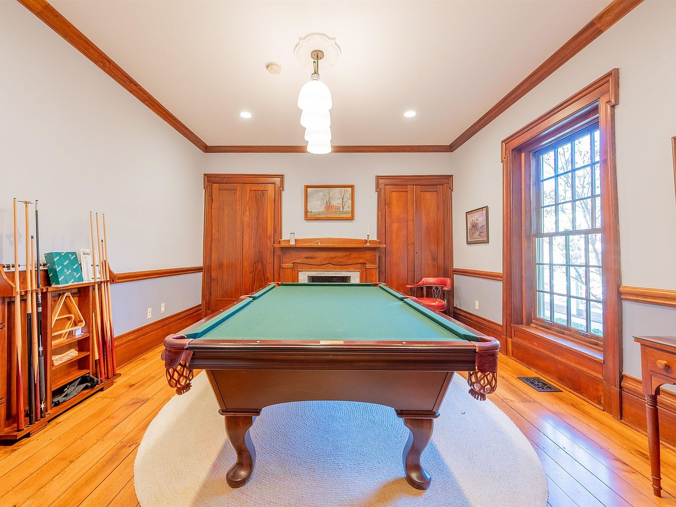 This elegant game room features rich wooden accents and a sophisticated ambiance, ideal for family gatherings and entertainment. The center of attention is a beautifully crafted billiard table, surrounded by warm, honey-toned hardwood flooring that enhances the cozy feel. The walls, painted in a serene light gray, contrast with the deep wooden trim and cabinetry, adding depth. Natural light floods through large windows, showcasing a view of the outdoors. A plush area rug under the table softens the space while offering comfort. Functional shelving discreetly holds gaming accessories, making this room a perfect blend of style and usability.