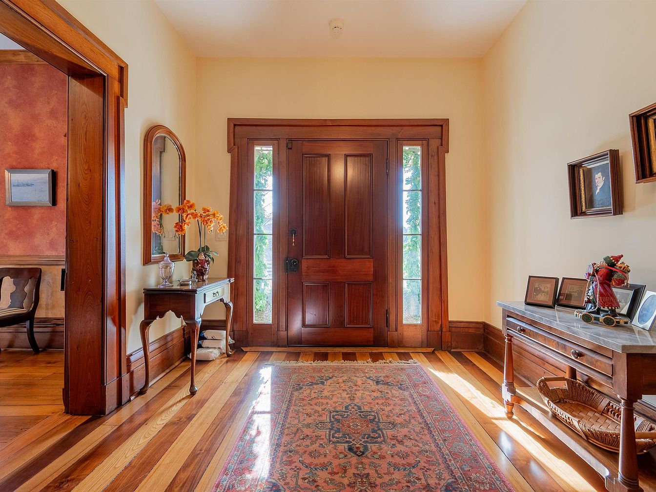 A welcoming front entrance combines charm and functionality, showcasing rich wooden double doors framed by large windows that invite natural light. The polished hardwood floors, with their intricate striping, lead the way, complemented by a tasteful area rug that adds warmth. An elegant console table adorned with a vase of vibrant orange orchids enhances the space, while a vintage mirror reflects light, creating an illusion of depth. Family-friendly features include ample room for guests to gather and enjoy conversation. Architectural detailing, such as the crown molding and classic chair rail, adds character, making this entryway both inviting and stylish.