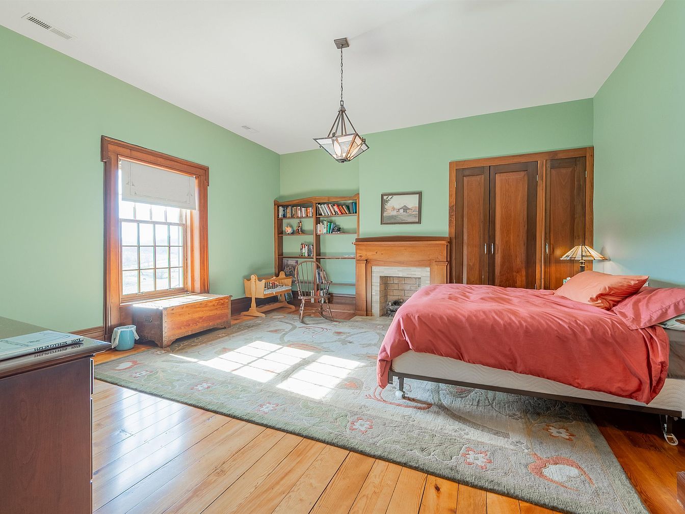 This inviting bedroom showcases a soothing light green palette, offering a tranquil atmosphere. The warm wooden trim and built-in storage add a touch of rustic charm while maximizing space. A plush area rug softly contrasts with the sleek hardwood floor, creating a cozy feel beneathfoot. Sunlight filters through large windows adorned with simple shades, illuminating the comfortable bed dressed in soft coral linens. A quaint reading nook is nestled by the window, featuring a wooden bookshelf and a charming chair, perfect for quiet afternoons. The elegant hanging lamp and decorative fireplace further enhance this family-friendly retreat.