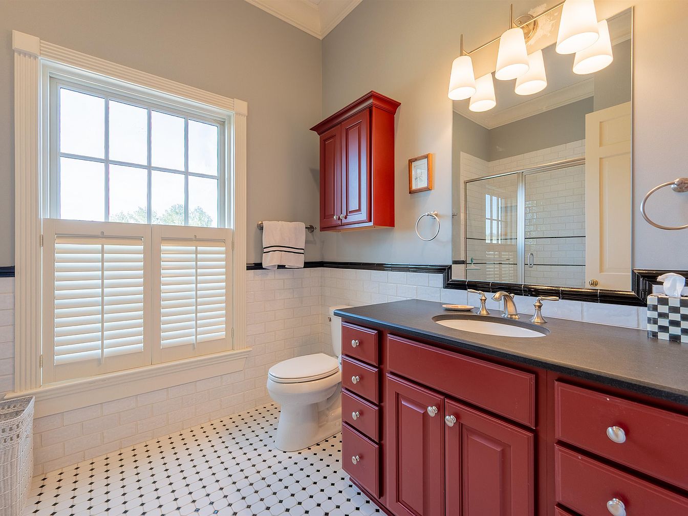 This bathroom combines classic charm with modern utility, showcasing a well-designed space featuring a striking red vanity that adds a splash of color against a neutral backdrop. The polished black countertop complements the vibrant cabinetry, while the intricate black and white tiled flooring enhances its timeless elegance. Large, well-placed windows flood the room with natural light, creating an airy atmosphere. Elegant light fixtures above the mirror add sophistication, and the thoughtful storage solutions ensure a clutter-free environment. With a family-friendly layout, this bathroom offers both style and functionality, making it a perfect retreat for relaxation.