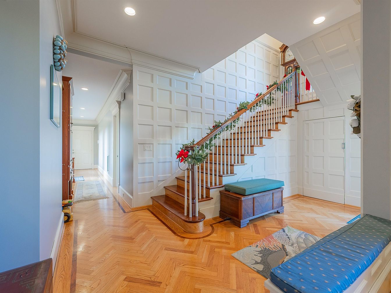 The entryway features an elegant wooden staircase, flanked by charming wainscoting and detailed wall paneling that exude classic sophistication. Natural light floods the space through strategically placed windows, enhancing the warm tones of the hardwood flooring, laid in a striking herringbone pattern. A plush blue bench offers a cozy spot for removing shoes, while family-friendly touches include a convenient closet for storage. Seasonal decorations along the bannister add a festive charm, making this space both inviting and functional. The layout allows for easy flow into the adjoining rooms, promoting a sense of togetherness in this beautiful home.