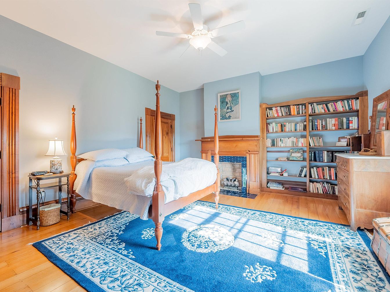 This charming master bedroom invites relaxation with its soft blue walls and warm wooden accents. The centerpiece is a beautifully crafted four-poster bed, adorned with crisp white linens, creating a serene atmosphere. A cozy reading nook features a classic bookshelf filled with novels, offering a perfect retreat. Natural light floods the space, accentuating the rich tones of the hardwood flooring and an elegant area rug that adds a touch of comfort. Architectural details like the intricately designed fireplace and vintage-style lamp illuminate the room, making it a family-friendly haven for rest and rejuvenation.