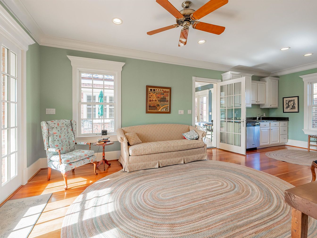 This inviting living area features a soothing sage-green color scheme, complemented by warm hardwood floors and a braided area rug that adds texture. A comfortable, patterned sofa and an elegant floral armchair provide ample seating for family gatherings. Natural light floods the space through large windows and French doors, creating a bright and airy atmosphere. A tasteful blend of modern and traditional elements is evident, from the sleek cabinetry in the kitchenette to the vintage artwork adorning the walls. The ceiling fan enhances airflow, making this room perfect for relaxation and quality time with loved ones.
