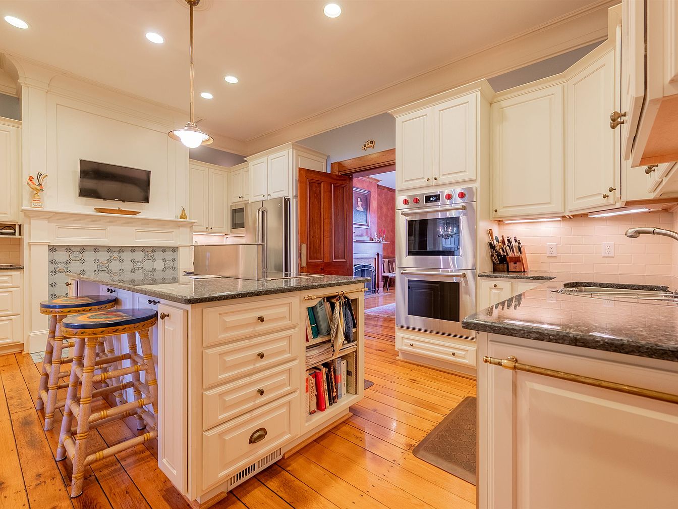 This spacious kitchen features a harmonious blend of traditional and contemporary elements, ideal for family gatherings. The white cabinetry reflects a fresh, clean aesthetic, complemented by rich wooden flooring that adds warmth. An inviting island serves as a focal point, offering bar seating with uniquely designed stools. The granite countertops provide ample workspace, while the stainless steel appliances promise efficiency. Subtle LED lighting enhances the ambiance, highlighting the decorative backsplash. Open accessibility to adjacent spaces fosters a sense of community, making it perfect for entertaining guests or enjoying casual family meals, showcasing a home designed for modern living.