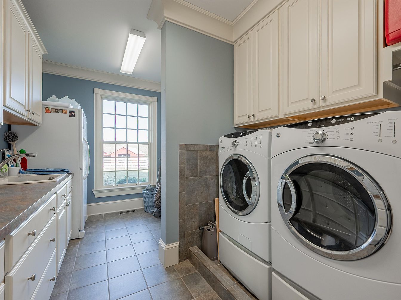 This inviting laundry room features a functional layout complemented by soft blue walls and polished tile flooring. Natural light floods in through a large window, creating a bright and airy atmosphere. The space is equipped with a modern washer and dryer, ensuring efficiency for busy families. Ample white cabinetry above provides generous storage for detergents and household items, while the sleek countertop offers a practical work area. Stylish neutral tiles blend seamlessly with the contemporary fixtures, while a laundry basket and organizing elements make this room both practical and visually appealing, perfect for managing daily chores.