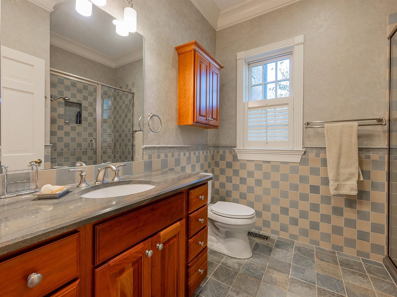 This beautifully designed bathroom combines functionality with elegant aesthetics. Featuring a solid granite countertop, the rich wood cabinetry offers ample storage while enhancing the space’s warmth. The soothing color palette of soft blues and grays harmonizes with the tiled walls, creating a serene atmosphere. A frameless glass shower enclosure showcases modern fixtures, making the area inviting and luxurious. Ample natural light floods the room through the window, while decorative crown molding adds a touch of sophistication. Overall, this family-friendly bathroom balances style and practicality, ensuring a comfortable, relaxing retreat for all.