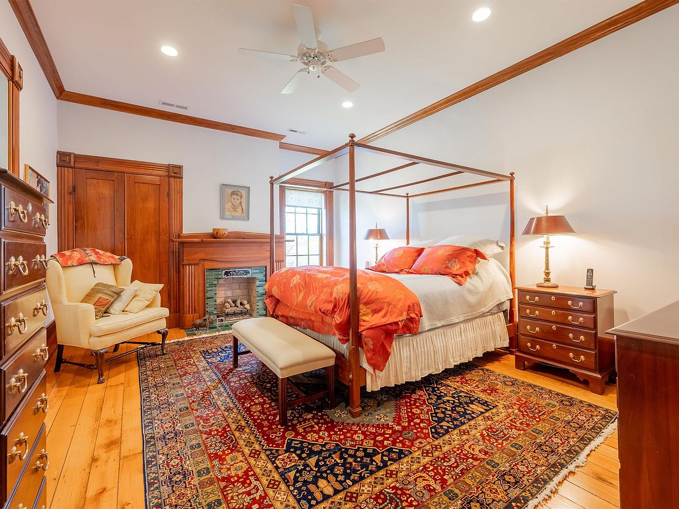 This inviting master bedroom showcases a perfect blend of modern comfort and classic elegance. A majestic four-poster bed adorned with vibrant floral linens serves as the centerpiece, complemented by warm wooden furnishings and intricate details. Rich hardwood flooring adds warmth, enhanced by a colorful area rug that ties the room together. Natural light floods in through the windows, highlighting the elegant fireplace, framed by a striking green tile surround. Cozy seating invites relaxation, while the decor maintains a family-friendly atmosphere, making it a serene sanctuary for restful nights and rejuvenating mornings.