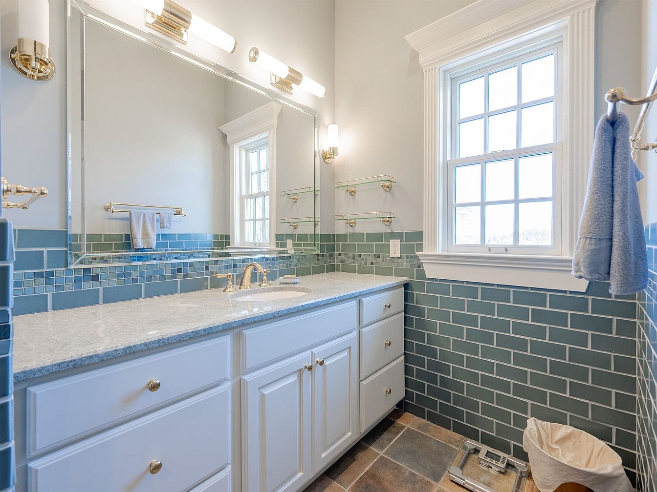This bathroom presents a modern yet cozy aesthetic, blending functionality with visual appeal. The spacious layout features a polished granite countertop contrasted beautifully with an intricate tile backsplash in varying shades of blue and green. Elegant gold fixtures add a touch of luxury, complementing the crisp white cabinetry. Natural light filters in through the classic window, enhancing the serene atmosphere. Thoughtfully placed glass shelves provide convenient storage, promoting an organized space. The warm stone floor ties the design together, ensuring both comfort and durability, making it perfect for family use while exemplifying contemporary elegance.