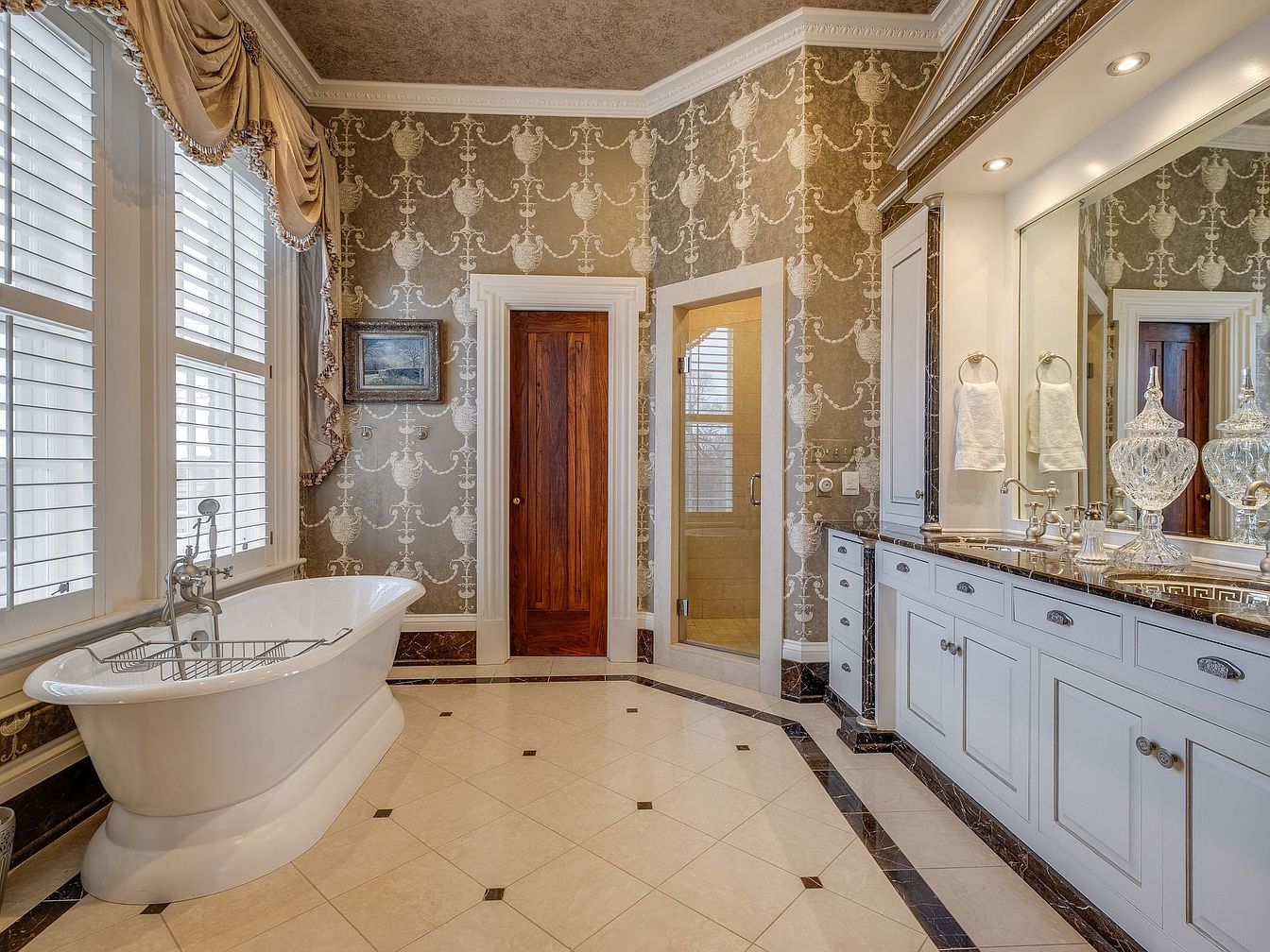 This exquisite bathroom combines elegance and functionality, featuring a freestanding soaking tub that serves as a stunning focal point. The intricate wallpaper showcases a sophisticated pattern, harmonizing beautifully with the rich wooden accents of the door and cabinetry. Plush window treatments filter natural light, enhancing the serene atmosphere. A spacious double vanity adorned with luxurious fixtures and a marble countertop complements the minimalist aesthetic. Large window shutters provide privacy while allowing light to bathe the space. The seamless layout encourages relaxation, making it a perfect family-friendly retreat designed for comfort and style.