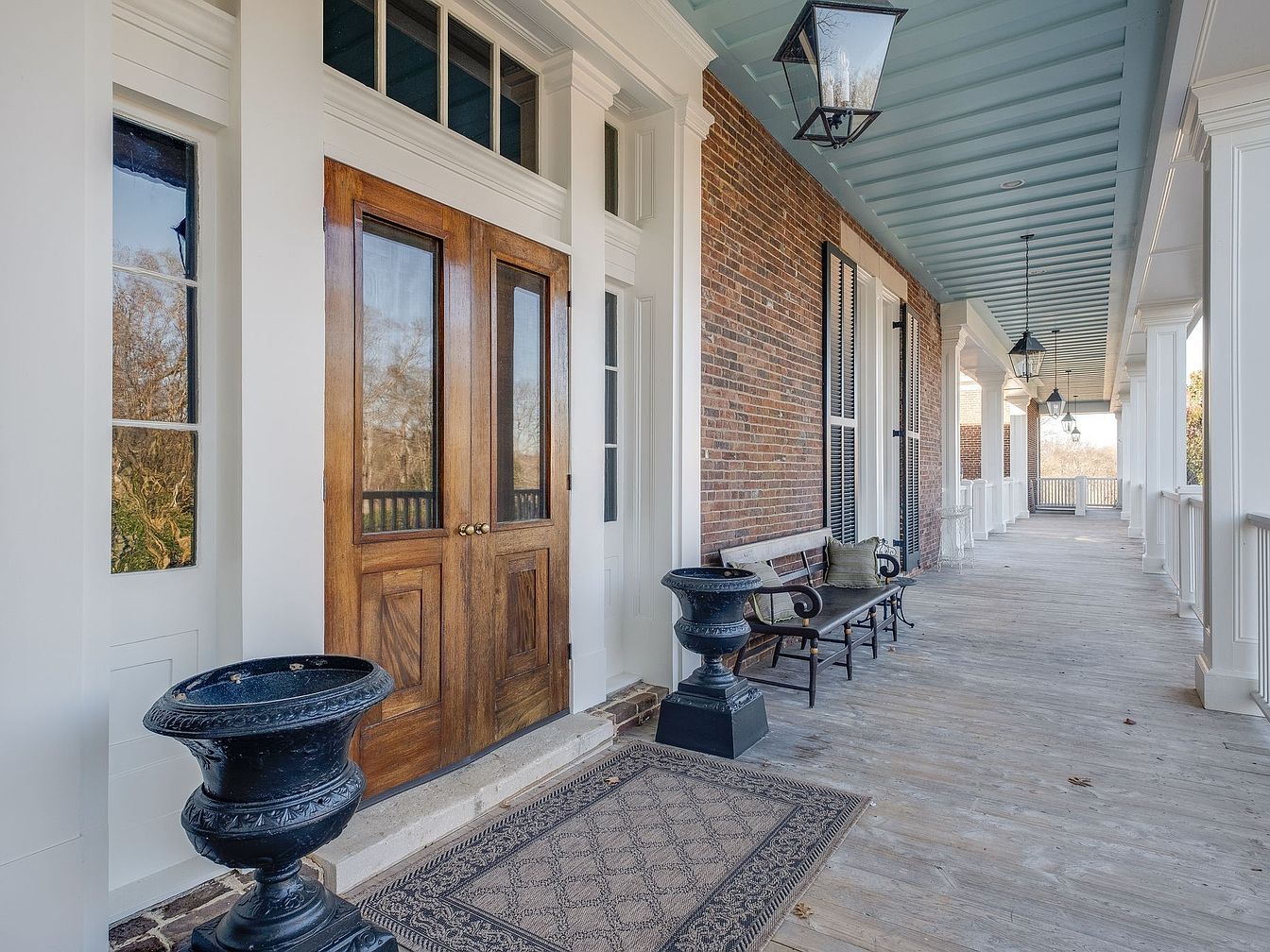 This inviting front porch showcases a harmonious blend of rustic charm and modern elegance. The rich wood double doors stand as a focal point, flanked by tall, slender windows that enhance natural light. A striking blue ceiling contrasts beautifully with the warm brick wall and white trim, creating an airy, welcoming atmosphere. The aged wooden flooring adds character, complemented by stylish black urns that frame the entrance. Cozy seating, highlighted with plush cushions, invites conversation and relaxation. Lantern-style fixtures bring a touch of sophistication, making this porch an ideal gathering spot for family and friends.