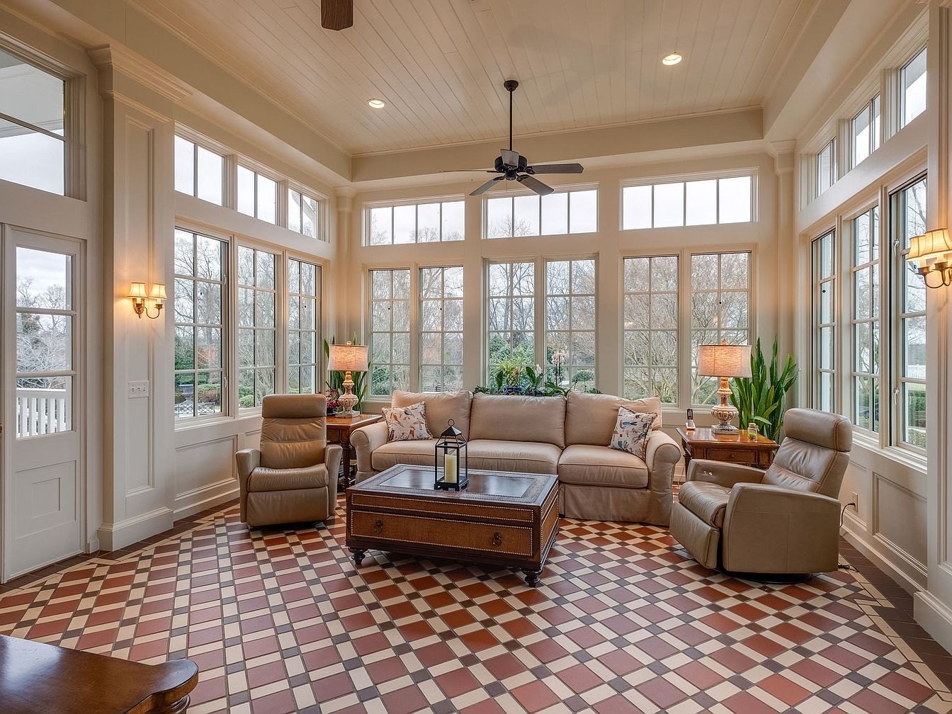 This inviting sunroom features an open layout with large, floor-to-ceiling windows that bath the space in natural light and provide serene views of the surrounding landscape. The warm color scheme combines earthy tones with soft neutrals, creating a welcoming atmosphere. A plush, beige sectional sofa is complemented by a decorative throw and a sturdy wooden coffee table, perfect for family gatherings. Stylish light fixtures illuminate the room while the unique tile flooring adds a rustic charm. Comfortable leather recliners enhance the relaxation experience, making this sunroom an ideal spot for leisurely afternoons and family bonding.