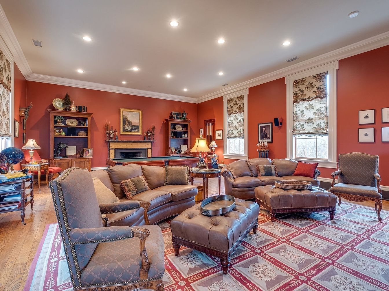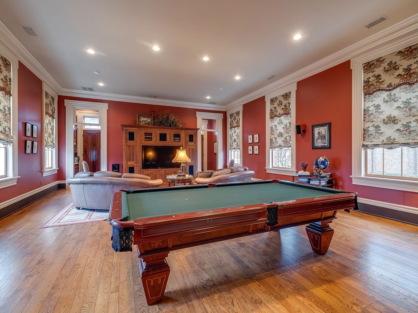 This inviting game room is designed for relaxation and entertainment, featuring a prominent billiard table as its centerpiece. The rich, earthy tones of the warm brown hardwood flooring complement the striking, deep red walls adorned with elegant floral-patterned window treatments. Generously sized for family gatherings, plush seating arrangements are strategically placed to encourage conversation. Natural light floods the room through large windows, enhancing the cozy atmosphere, while decorative touches like framed artwork and tasteful accessories add charm. The combination of classic architectural elements, such as crown molding, and modern amenities creates a perfect balance for family-friendly leisure.