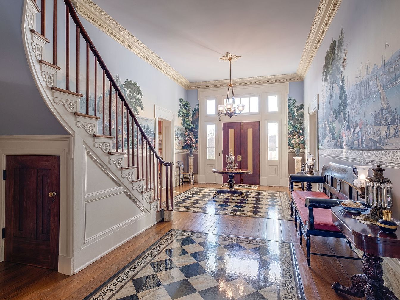 This elegant entryway presents a harmonious blend of classic design and modern comfort. A grand staircase with ornate wooden banisters leads to the upper levels, while large windows illuminate the space. The historical mural on the wall features serene landscapes, enhancing the inviting atmosphere. Polished hardwood flooring showcases a striking diamond pattern, creating visual interest. A chic console table is accented with decorative lanterns, providing both ambiance and functionality. Comfortable seating along the wall allows for casual conversation, making this entryway not just a passage but a warm welcome into the home.