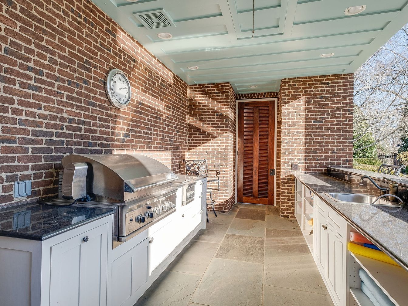This outdoor kitchen combines elegance and functionality, featuring a stunning brick wall that adds rustic charm. The space includes a professional-grade stainless steel grill and expansive granite countertops, perfect for family gatherings. Designed for ease of use, the layout accommodates multiple chefs with ample prep space and convenient storage beneath the countertops. A beautiful mint green ceiling contrasts with the earthy tones of the bricks and natural stone flooring, creating a refreshing environment. Ample natural light floods the area, enhancing the inviting atmosphere, while nearby seating provides comfort for guests enjoying alfresco meals.