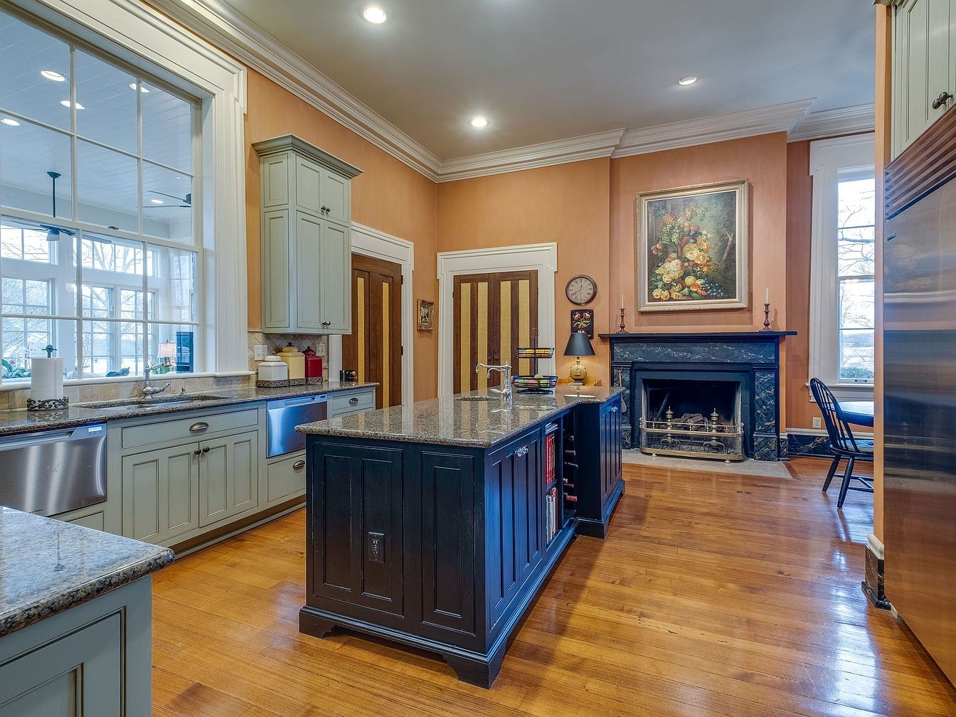 This gourmet kitchen showcases a harmonious blend of classic and modern design elements. The spacious layout features an expansive island with a striking dark blue cabinetry that contrasts beautifully with light gray cabinets lining the walls. An elegant granite countertop complements the functional stainless steel appliances and adds to the room’s sophisticated aesthetic. A cozy fireplace framed by tasteful artwork enhances the warm ambiance, while large windows fill the space with natural light, offering views of the outdoor scenery. Family-friendly features include ample storage, accessible layout, and inviting seating areas, making it ideal for gatherings and culinary adventures.