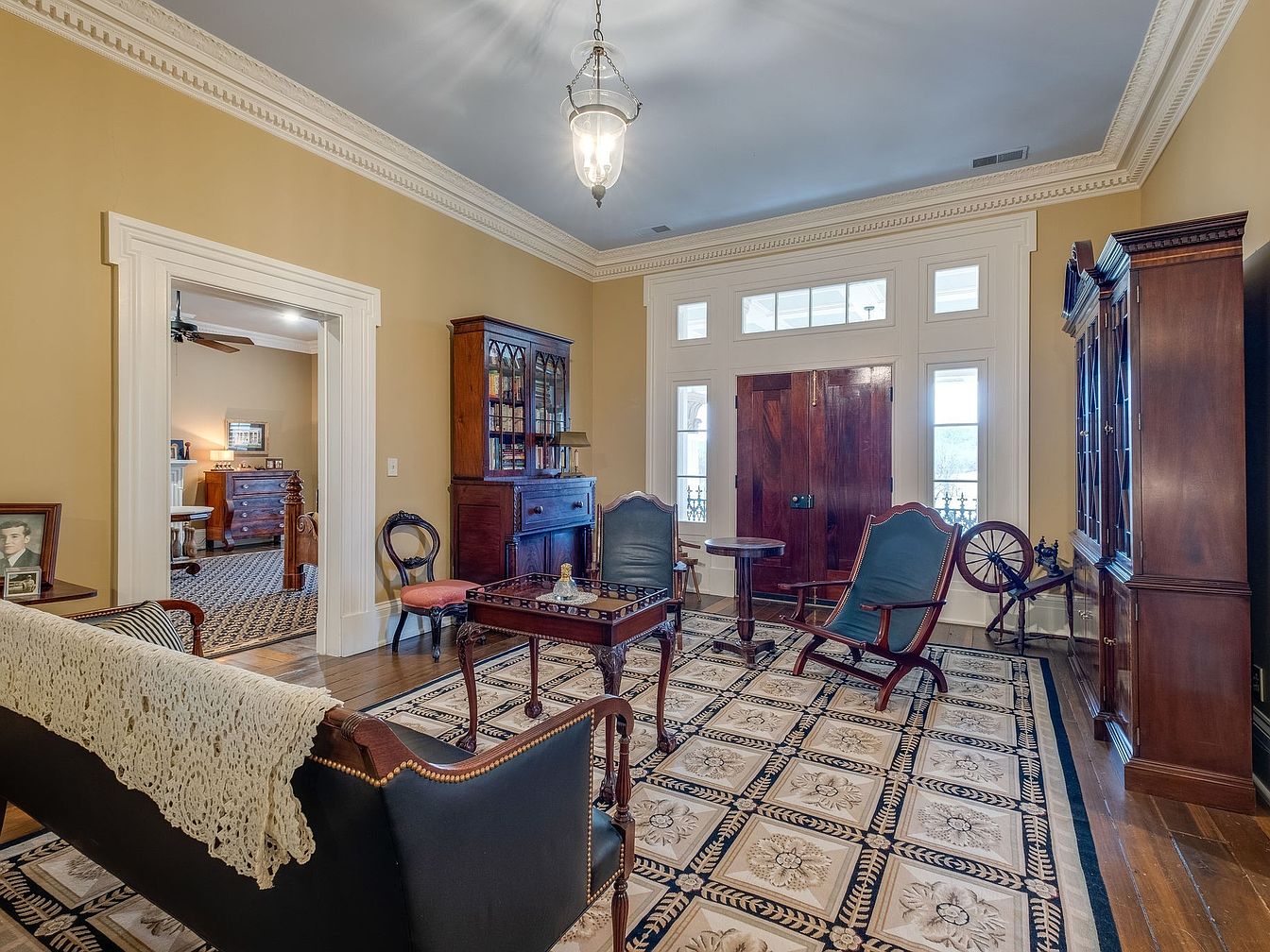 This elegant living room blends classic design with family-friendly features, showcasing a rich color palette of warm earth tones. Architectural details include intricate crown molding and large windows that invite natural light, enhancing the room’s spacious feel. A beautifully crafted dark wood china cabinet serves as a focal point, complemented by plush seating that encourages relaxation and conversation. The ornate area rug adds texture and warmth, beautifully framing the hardwood floor. Decorative elements like framed photographs and vintage accents create a personal touch, making this inviting space perfect for family gatherings and quiet evenings alike.