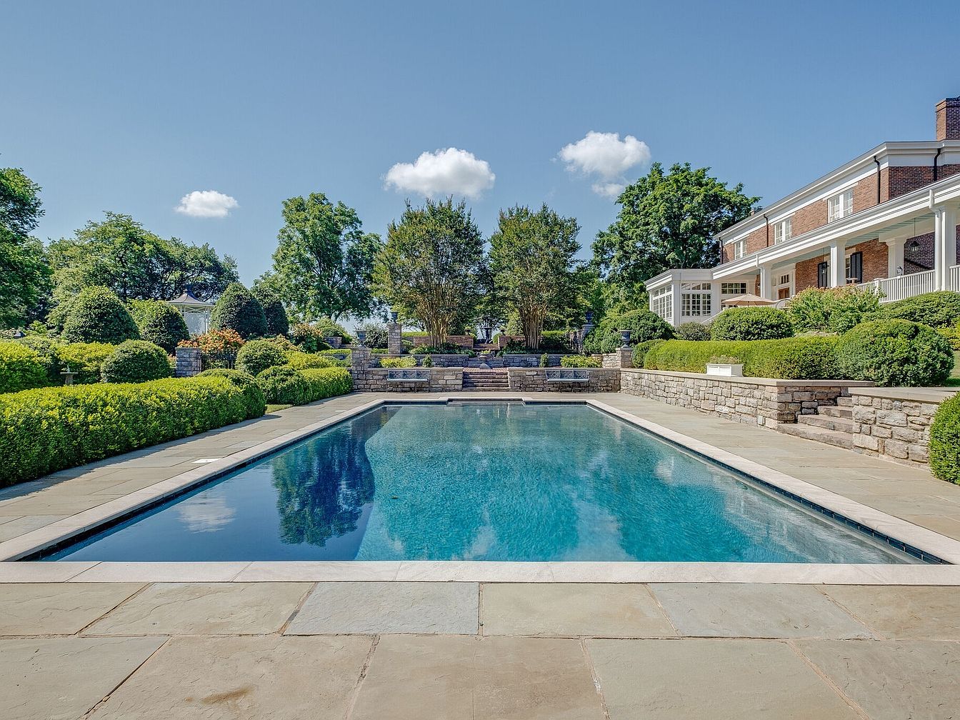 This stunning backyard oasis features a serene swimming pool surrounded by meticulously manicured landscaping. Lush green hedges and vibrant flower beds create a vibrant contrast against the tranquil blue water. Paved with natural stone, the pool deck invites relaxation and outdoor gatherings. Integrated stone steps ascend to tiered garden levels, enhancing the visual appeal and offering a natural flow throughout the space. Large trees provide shade, while the house’s elegant exterior boasts classic architectural detailing with white accents. This family-friendly retreat promises endless enjoyment, merging leisure, beauty, and nature.