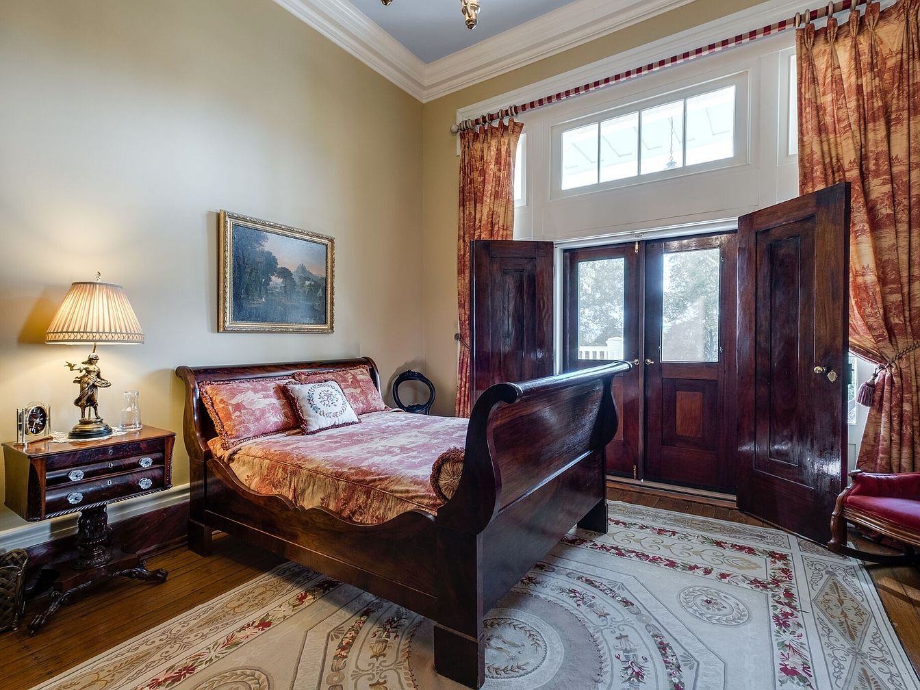 This master bedroom exudes elegance and warmth, featuring a stunning vintage sleigh bed adorned with rich, patterned bedding that invites relaxation. The soft color palette of muted greens and warm neutrals complements the intricate floral-patterned rug underfoot. Tall, luxurious drapes frame the large windows, allowing natural light to filter in while providing privacy. A charming bedside table holds a classic lamp, casting a gentle glow during the evening. Architectural details include high ceilings and ornate moldings, enhancing the sense of spaciousness. This inviting space perfectly balances comfort with timeless sophistication, ideal for restful nights.