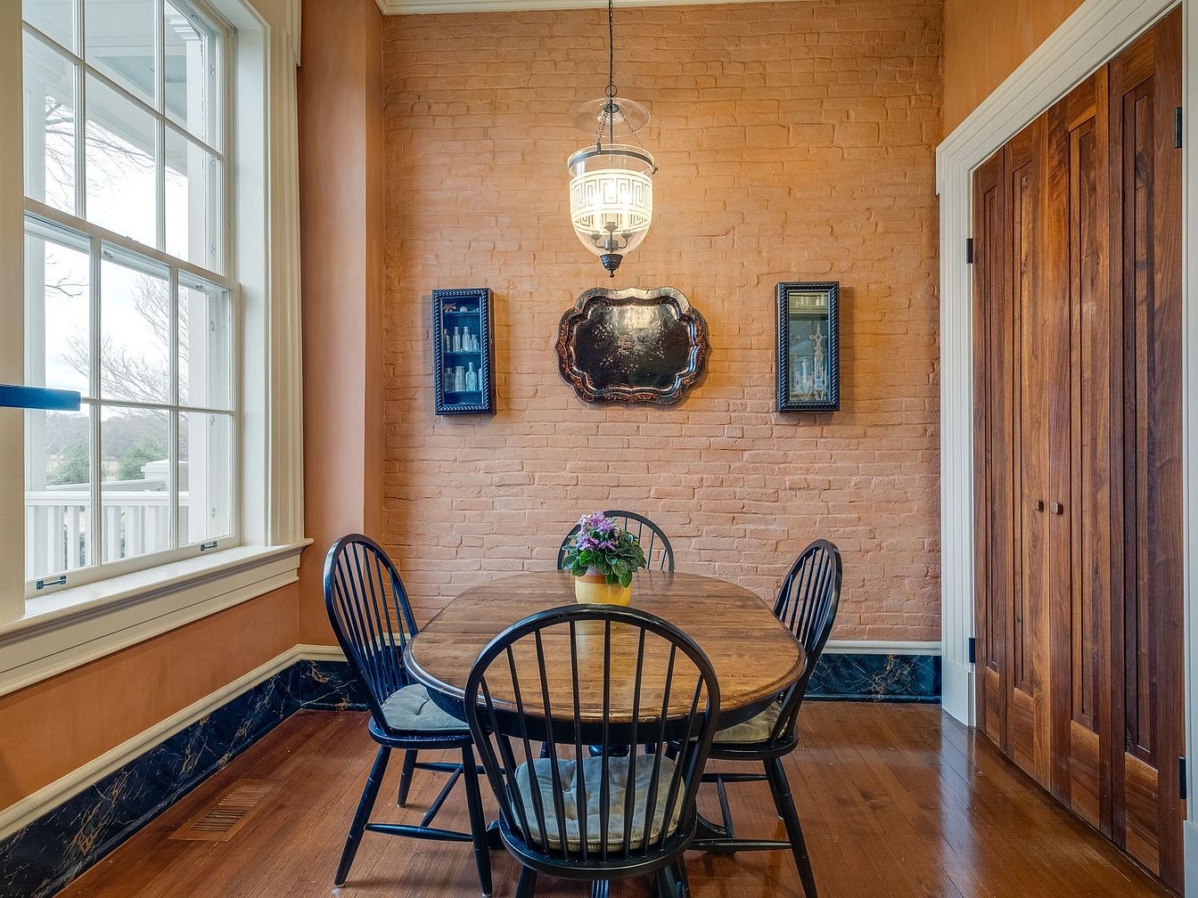 This inviting dining nook features a round wooden table surrounded by sleek black chairs, creating a cozy yet stylish atmosphere. The warm, brick accent wall adds texture, complemented by soft peach tones that brighten the space. A striking pendant light hangs gracefully above, illuminating the table for family meals. Large windows provide ample natural light and views of the outdoors, enhancing the airy feel. Rich wood cabinetry offers practical storage solutions, while elegant details like framed artwork and decorative glass enhance the room’s character. This area is perfect for casual dining or gathering with loved ones.