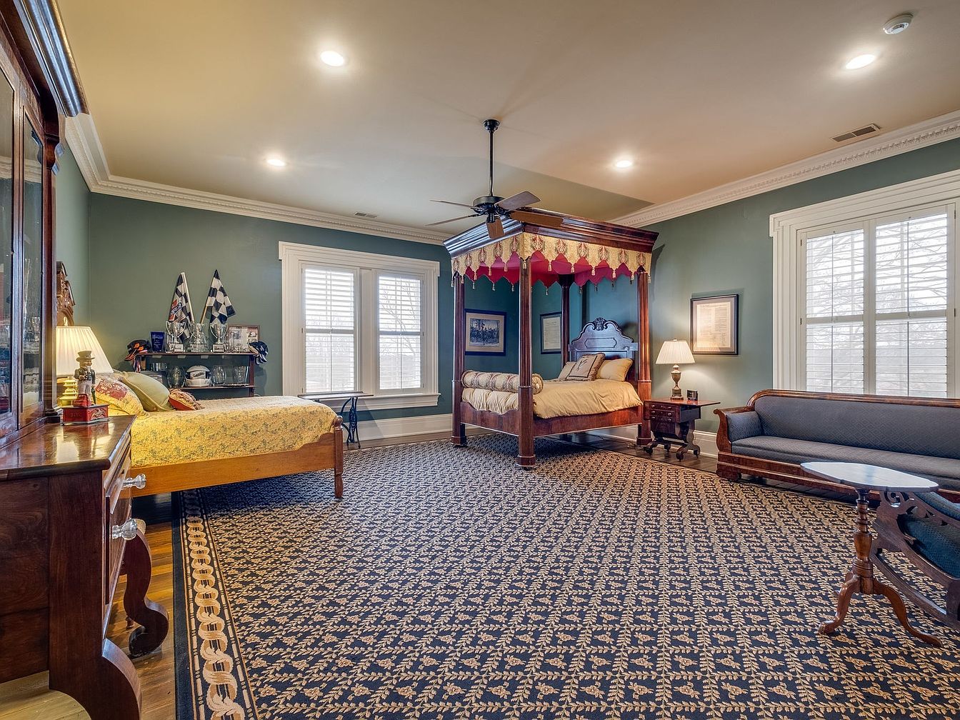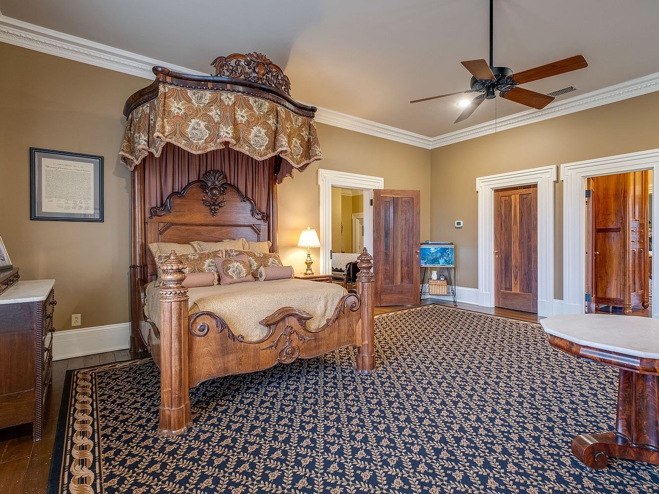 This master bedroom exudes elegance with its ornate four-poster bed featuring intricate woodwork and luxurious fabrics. The warm earthy tones on the walls create a cozy atmosphere, complemented by a rich navy and gold patterned area rug. High ceilings enhance the spacious feeling, and the ceiling fan adds comfort on warmer days. Stylish wooden doors and classic trim showcase the home’s architectural charm. Soft lighting from bedside lamps and a small TV nook create a welcoming ambiance, perfect for relaxation. This room blends timeless design with family-friendly features, making it an ideal retreat for restful nights.