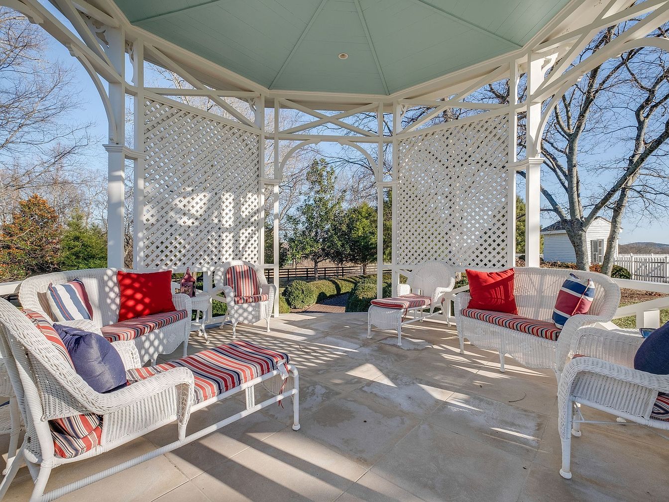 A stunning outdoor living area merges sophistication with comfort. The spacious patio features elegant hardscaping and a pristine swimming pool, surrounded by meticulously landscaped gardens and lush greenery. The interplay of brick and stone pathways creates a welcoming atmosphere. Nearby, a charming gazebo provides a perfect spot for family gatherings or quiet retreats. This home balances classic architecture with modern amenities, highlighted by the expansive porch ideal for leisurely evenings. Vibrant foliage and structured hedges enhance privacy while inviting nature into daily life, establishing a serene escape for relaxation and outdoor entertaining.