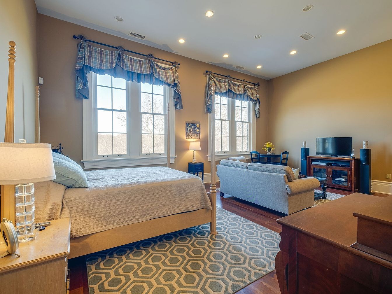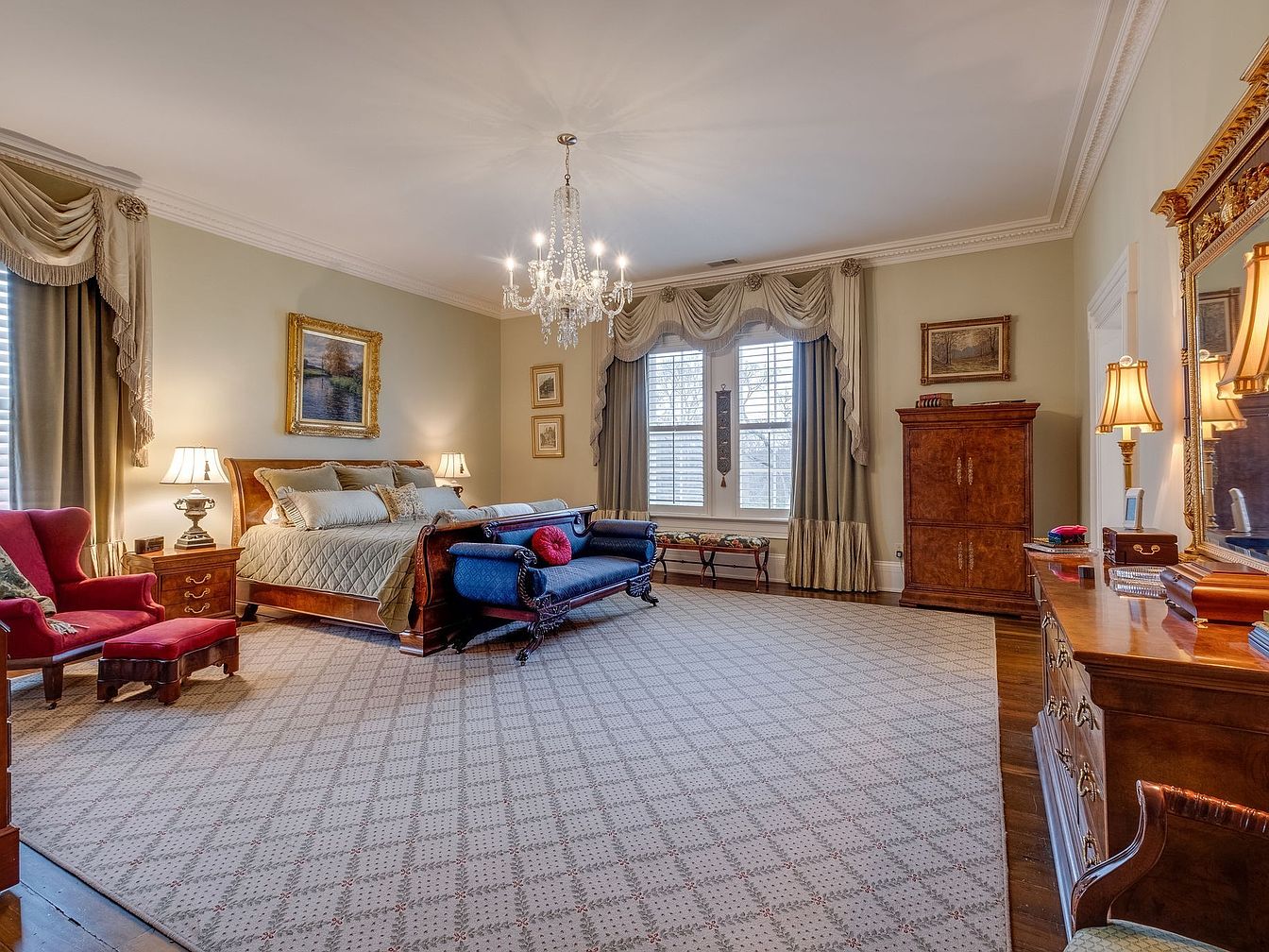 This master bedroom embodies classic elegance with a spacious layout that invites relaxation. Featuring a sumptuous king-sized bed adorned in soft gray linens and decorative cushions, it blends comfort with style. The rich wooden furniture, including a charming dresser and antique wardrobe, adds warmth to the room. Tall windows draped with luxurious curtains allow natural light to flood in, highlighting the subtle green walls and intricate crown molding. A plush area rug accentuates the hardwood flooring, while tasteful artwork emphasizes a serene atmosphere. The cozy seating area, with a striking red armchair, provides a perfect nook for quiet moments.