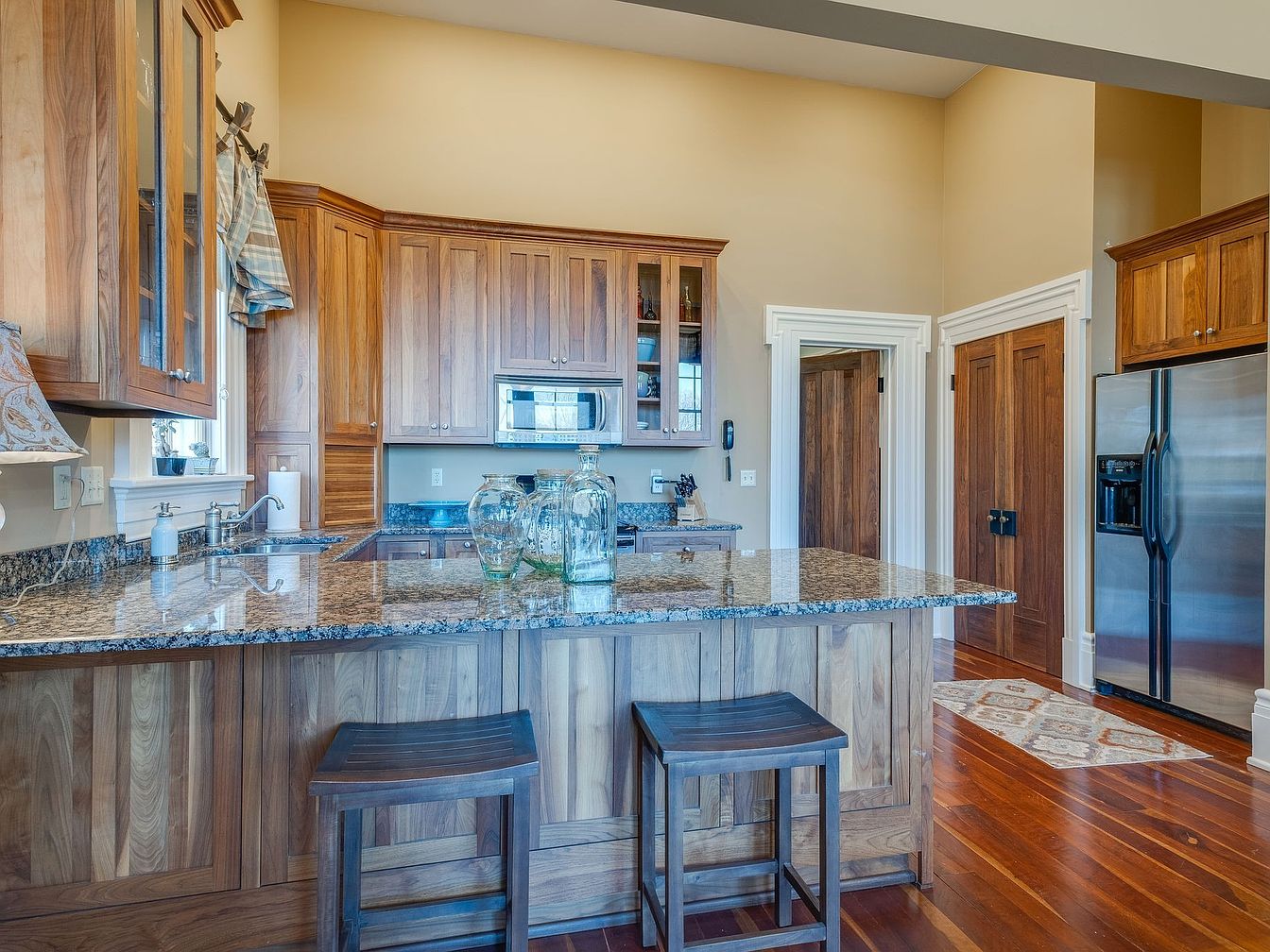 This inviting kitchen features rich wooden cabinetry that brings warmth and character to the space. A spacious granite countertop offers ample preparation area while serving as a casual dining spot with sleek, dark wooden stools. Natural light floods in through large windows, enhancing the soft beige walls and creating a welcoming atmosphere. Family-friendly elements include easy-to-reach shelves and modern appliances seamlessly integrated into the design. The elegant tile flooring, complemented by an intricate area rug, ties the room together, making it both functional and aesthetically pleasing. A perfect blend of comfort and style for culinary enthusiasts.