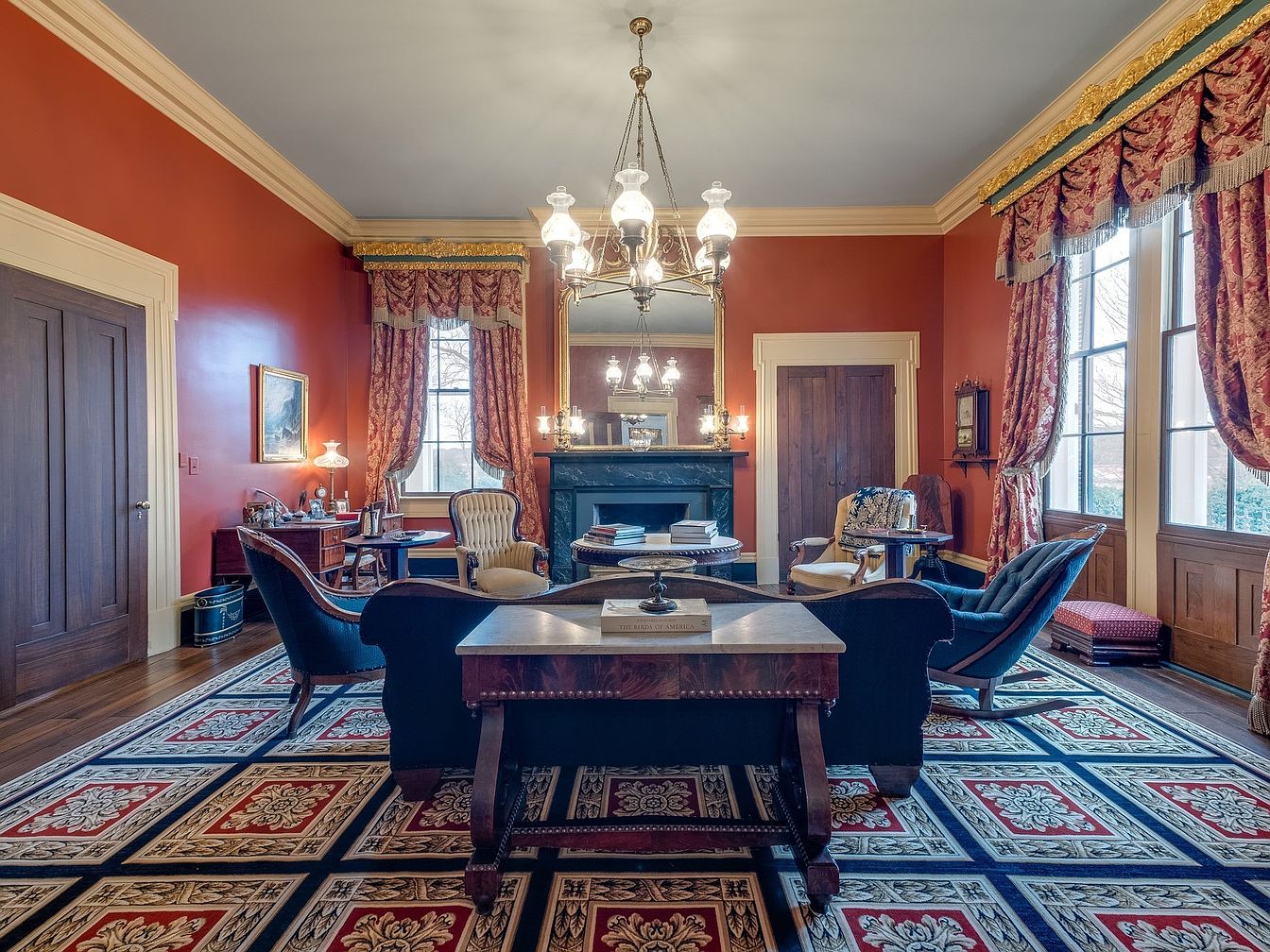 Richly adorned in deep red, this elegant living room showcases a sophisticated design. The intricate rug in hues of blue and beige anchors the space, while classic furniture pieces provide a warm, inviting atmosphere. A grand chandelier hangs from the ceiling, complemented by soft wall sconces that illuminate the room’s carefully curated decor. Large windows dressed in lavish drapery invite natural light, highlighting the detailed architectural moldings. The central seating area features plush armchairs and a refined coffee table, creating a perfect setting for family gatherings or intimate conversations. This timeless space blends comfort with elegance beautifully.