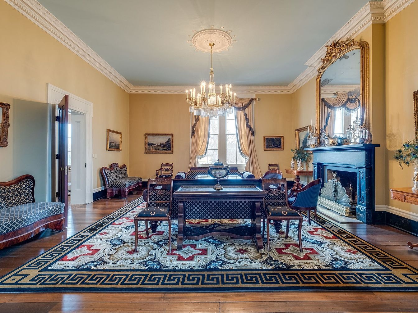 This elegant dining room features a generous layout with refined architectural details, including tall windows adorned with ornate drapes that flood the space with natural light. Highlighted by a sophisticated chandelier, the room boasts a stunning area rug that anchors the furniture with its intricate patterns. Antique furnishings, including intricately carved chairs and a beautifully designed table, offer family-friendly seating for gatherings. The warm golden walls complement the rich, dark wooden flooring, enhancing the room’s classic charm. Decorative mirrors and art pieces add depth, reflecting the room’s luxe aesthetic, perfect for memorable dining experiences.