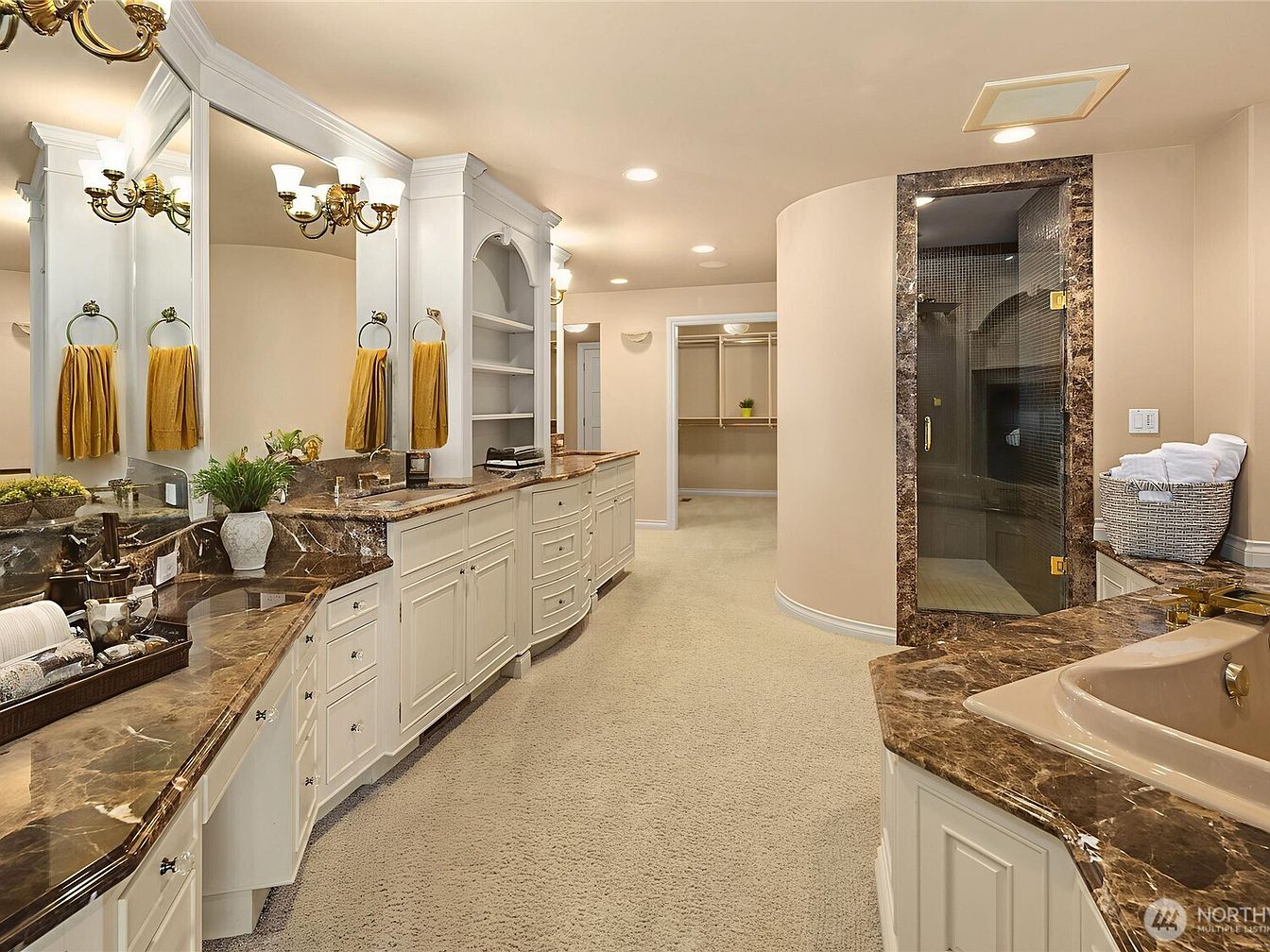 This master bathroom boasts a stunning curved layout, featuring luxurious marble countertops and white cabinetry that exudes sophistication. The warm, earthy tones create a serene atmosphere, complemented by gleaming brass fixtures and a subtle gold accent in the plush towels. Dual sinks promote convenience for couples, while ample cabinetry provides excellent storage for essentials. A spacious glass shower showcases modern tile work, enhancing the spa-like vibe of the space. The gentle carpet underfoot and soft lighting add warmth and comfort, making this bathroom not only functional but also a perfect retreat for relaxation and self-care.