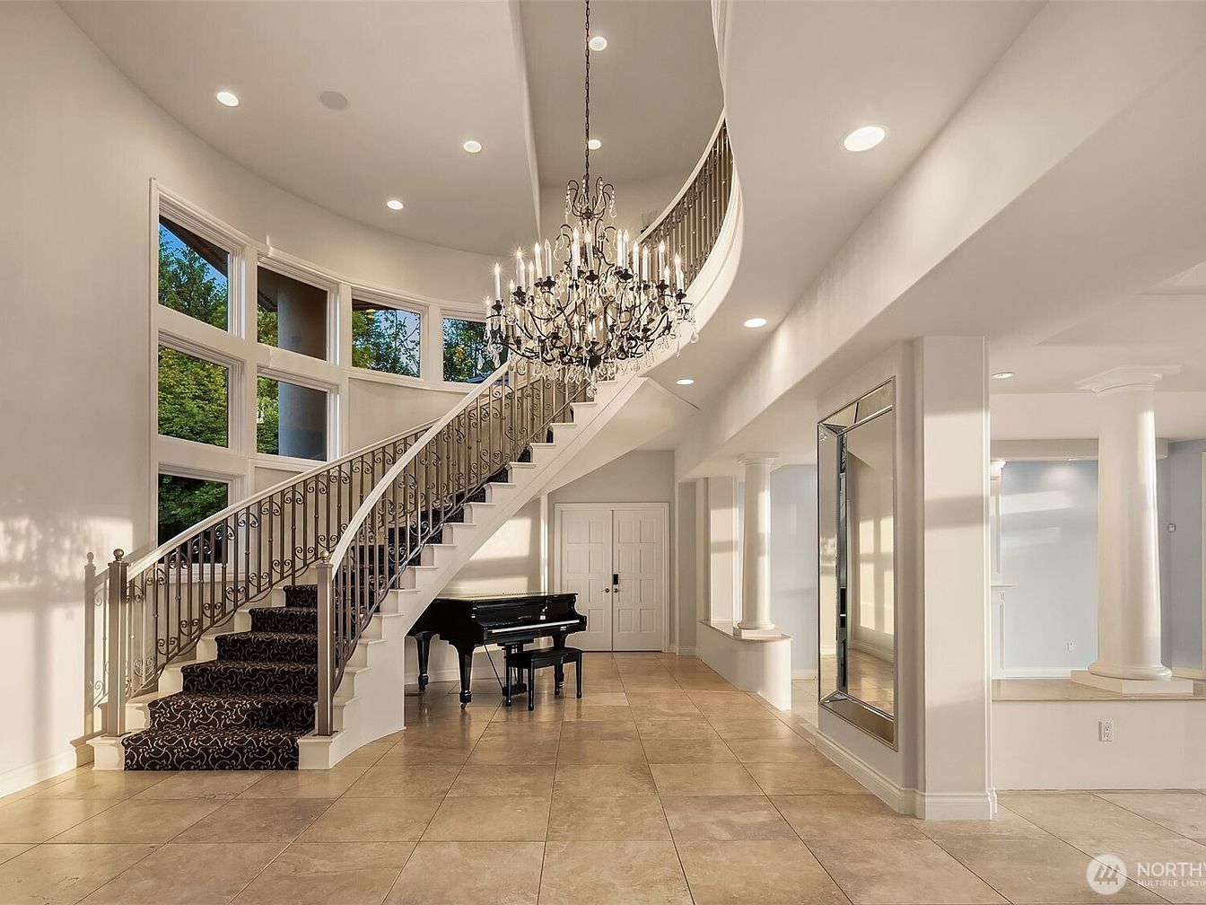 This stunning grand foyer showcases a sweeping staircase adorned with elegant wrought iron railings, inviting visitors into the home. The open concept layout is illuminated by a dramatic chandelier, cascading light onto the polished tile floor. Large, expansive windows frame the space, merging indoor luxury with the vibrant outdoor scenery. The neutral color palette of whites and soft greys enhances the airy feel, while subtle architectural details, such as the stately columns and custom mirror, provide sophistication. Ideal for families, this entrance seamlessly blends comfort with grandeur, setting a welcoming tone for the entire home.