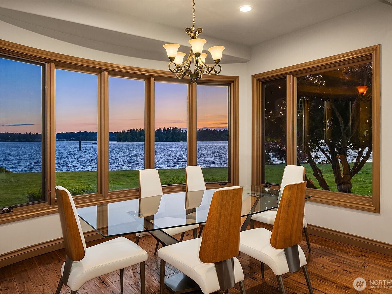 This inviting dining area offers breathtaking views of the serene waterfront, framed by large, rounded windows that enhance the connection with nature. A sleek glass table sits at the center, surrounded by elegantly designed chairs featuring warm wooden accents, creating a perfect blend of modern and cozy aesthetics. The rich, polished wood flooring adds warmth and texture, while the soft white walls keep the ambiance bright and airy. A stylish chandelier overhead adds a touch of sophistication, making this space ideal for family gatherings or intimate dinners, fostering both comfort and elegance in a picturesque setting.