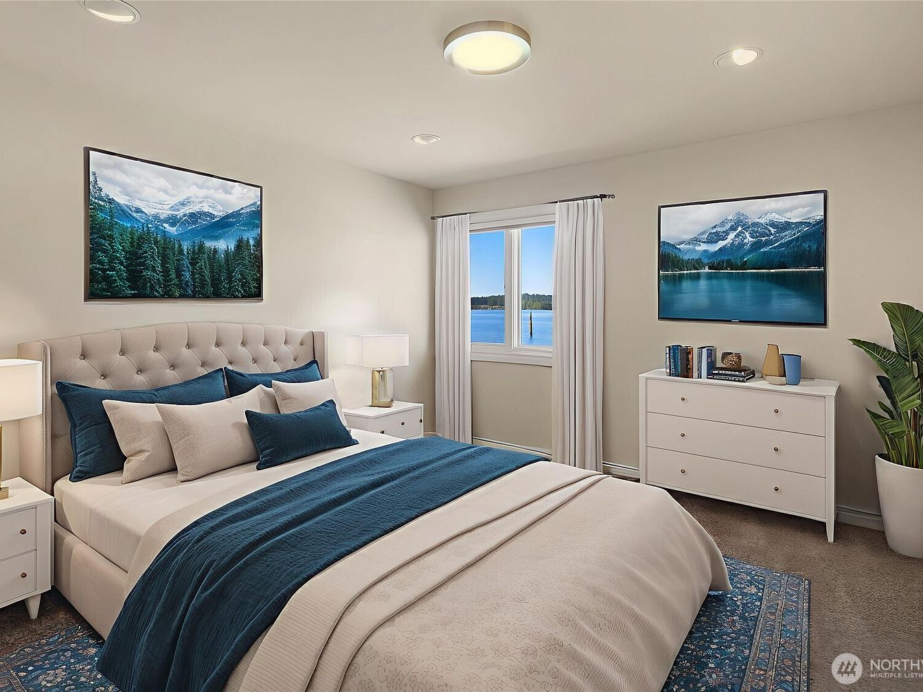 The master bedroom showcases a tranquil and inviting ambiance, perfect for relaxation. A plush tufted headboard complements a well-dressed bed, adorned with an array of soft cushions in shades of cream and deep teal. Light, airy curtains frame a picturesque window, offering stunning views of nature. A modern dresser maintains a clean aesthetic, while framed landscape artworks enhance the decor with a refreshing touch. Soft recessed lighting and stylish bedside lamps create a warm glow, promoting a cozy atmosphere. Featuring a corner plant, this room balances comfort and elegance, making it a delightful sanctuary for unwinding.