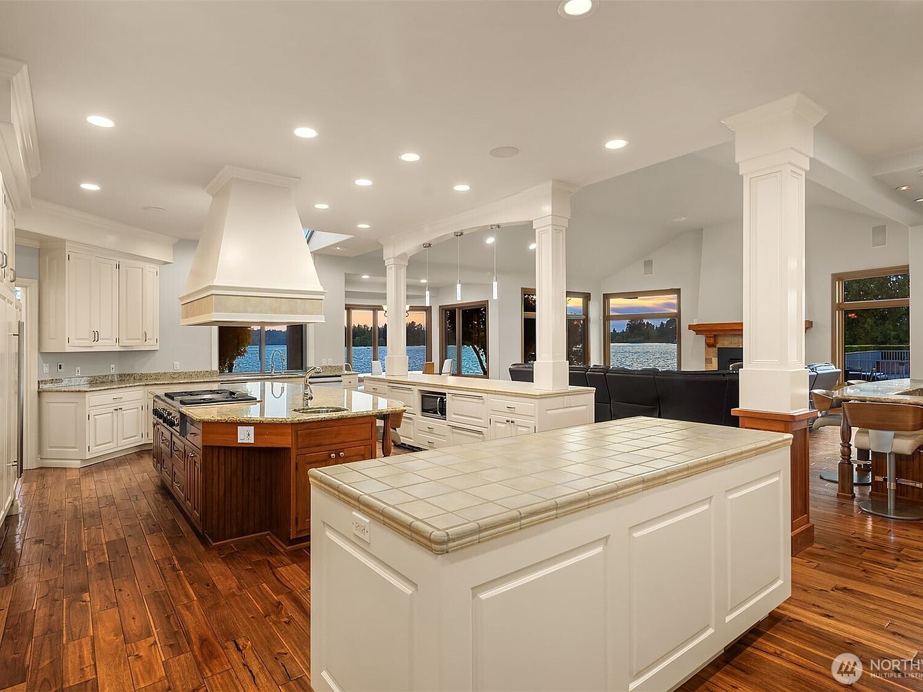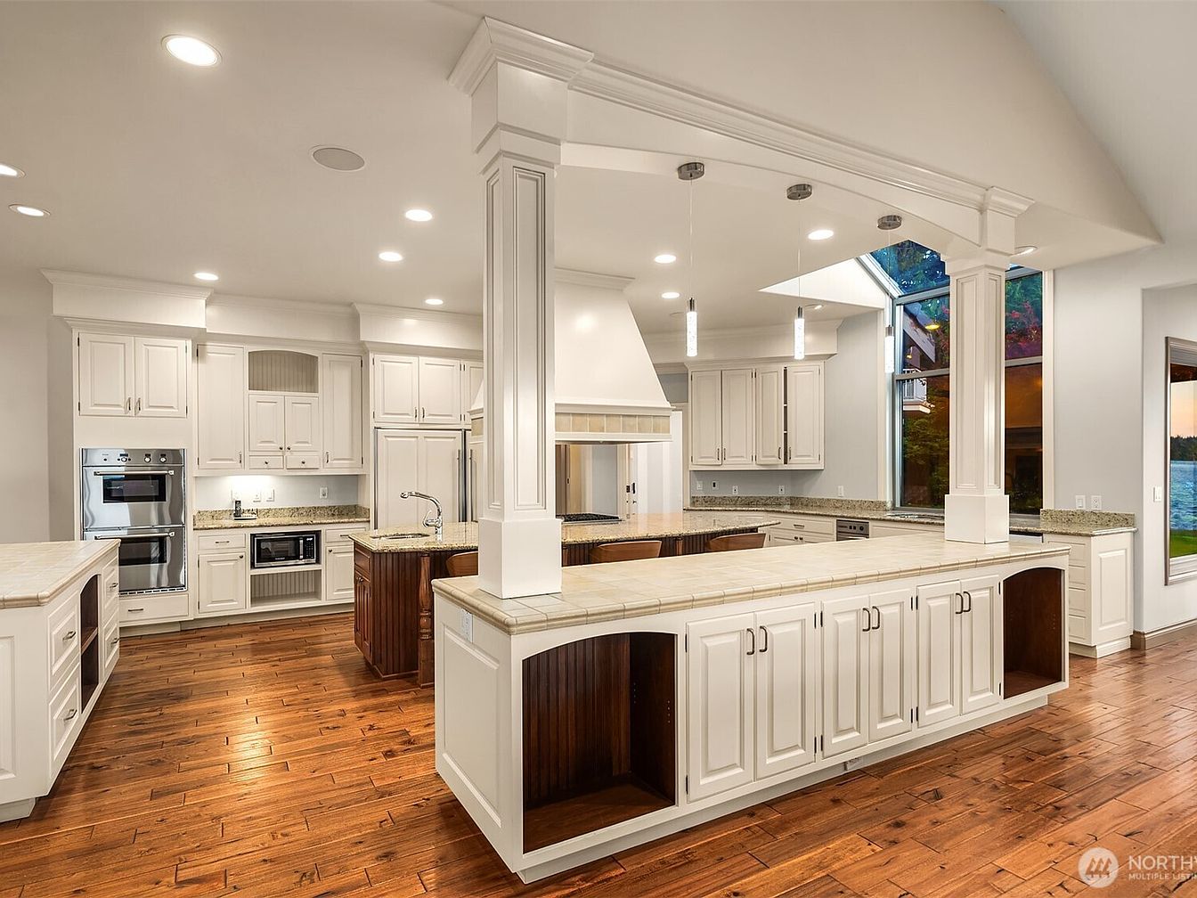 This expansive kitchen features rich wooden cabinetry and a striking central island with a polished granite countertop. Natural light floods the space through large windows, offering panoramic views of the serene lake outside and creating a warm atmosphere. The open layout fosters a family-friendly vibe, with ample room for gatherings and a cozy dining area nearby. Elegant pendant lights hang above the island, while the stylish range hood adds a touch of sophistication. The combination of light cabinetry against the dark hardwood flooring enhances the inviting, modern aesthetic, making this kitchen a perfect blend of functionality and style.